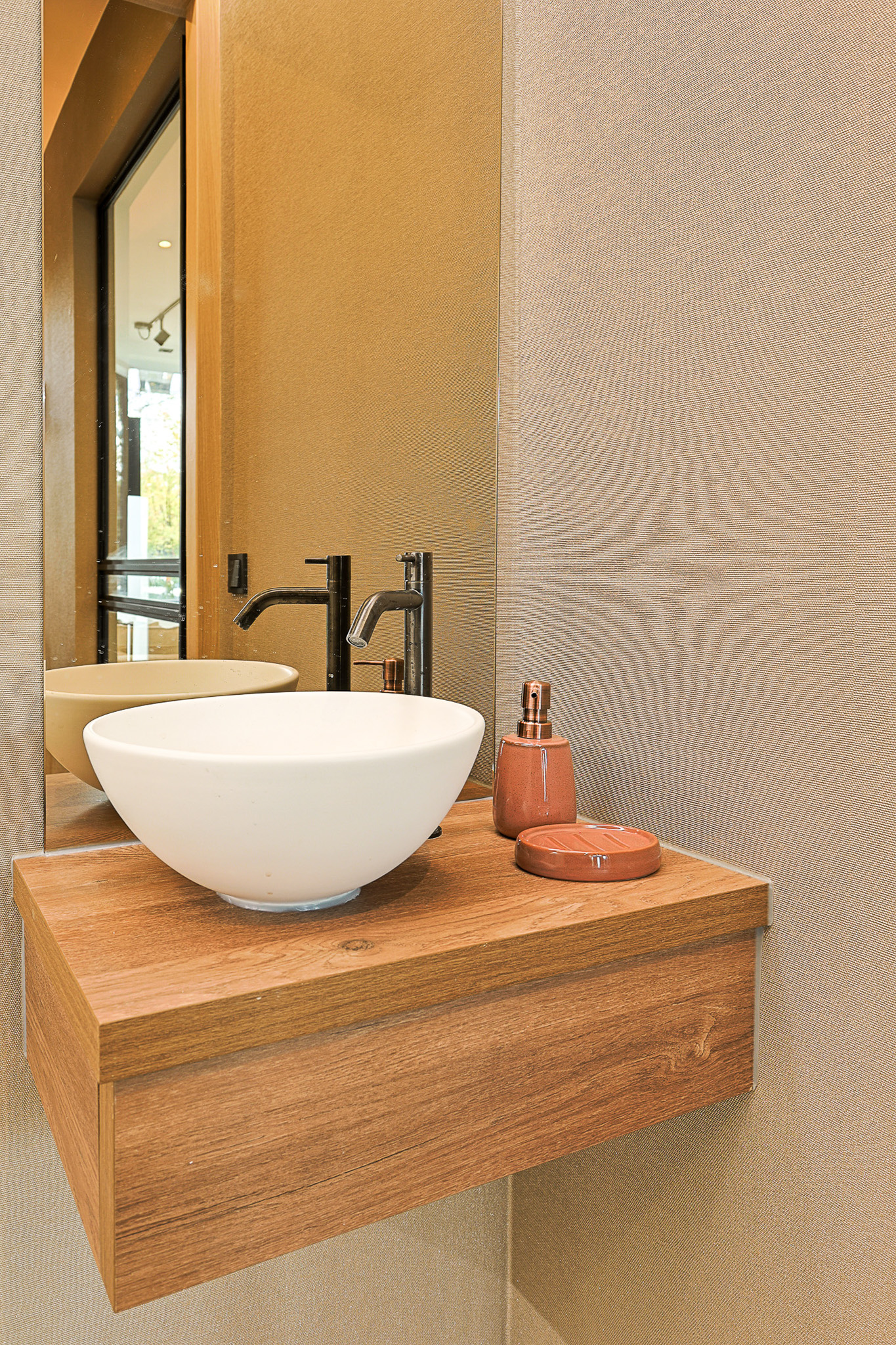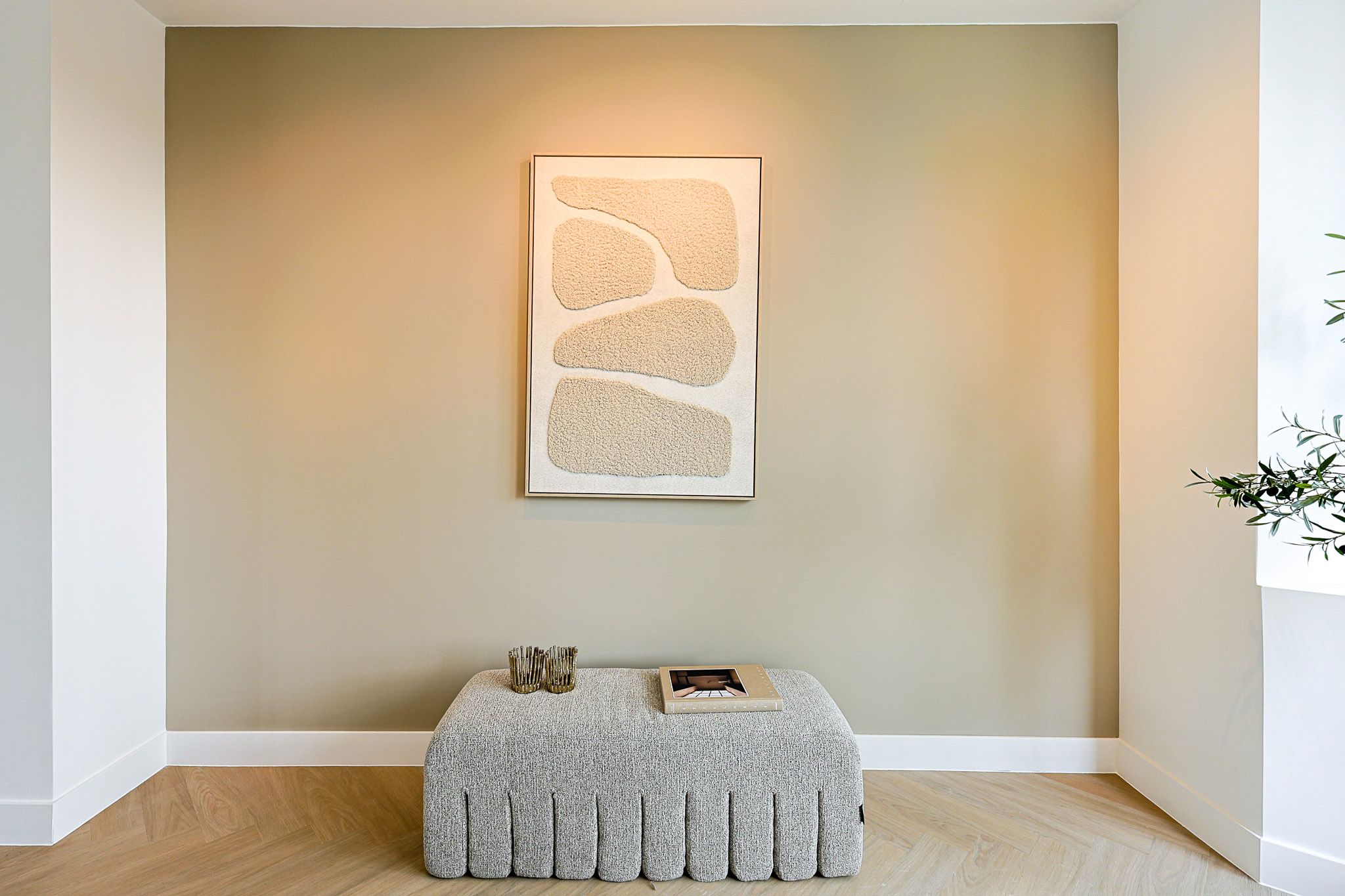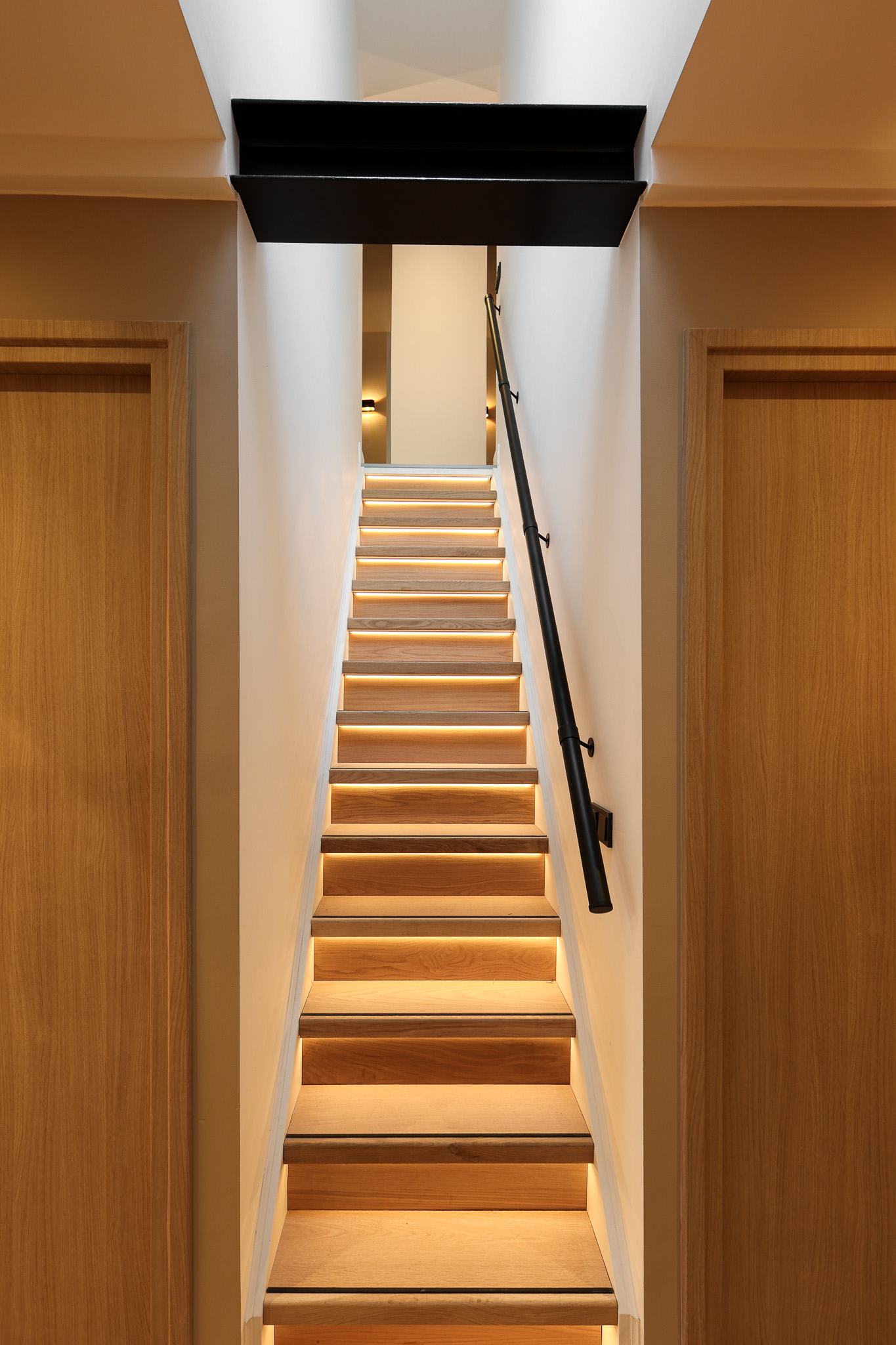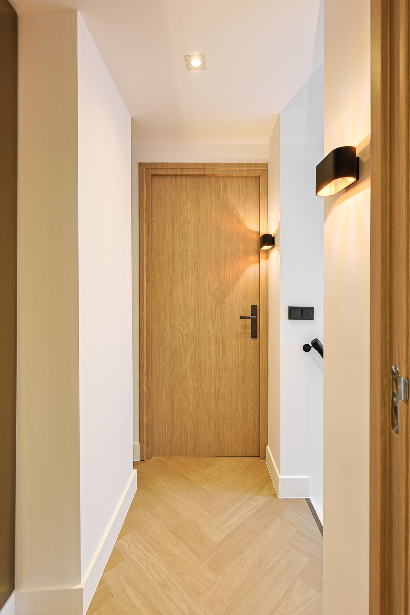 De chique overloop geeft toegang tot twee slaapkamers, twee badkamers en de trap naar de tweede verdieping. De trap is stijlvol verlicht en op deze verdieping ligt, net als elders, een hoogwaardige pvc-vloer.