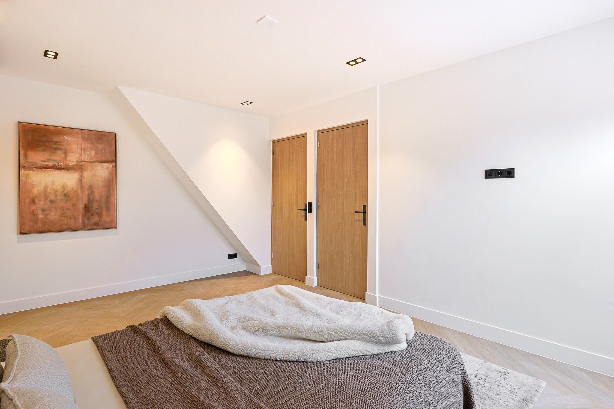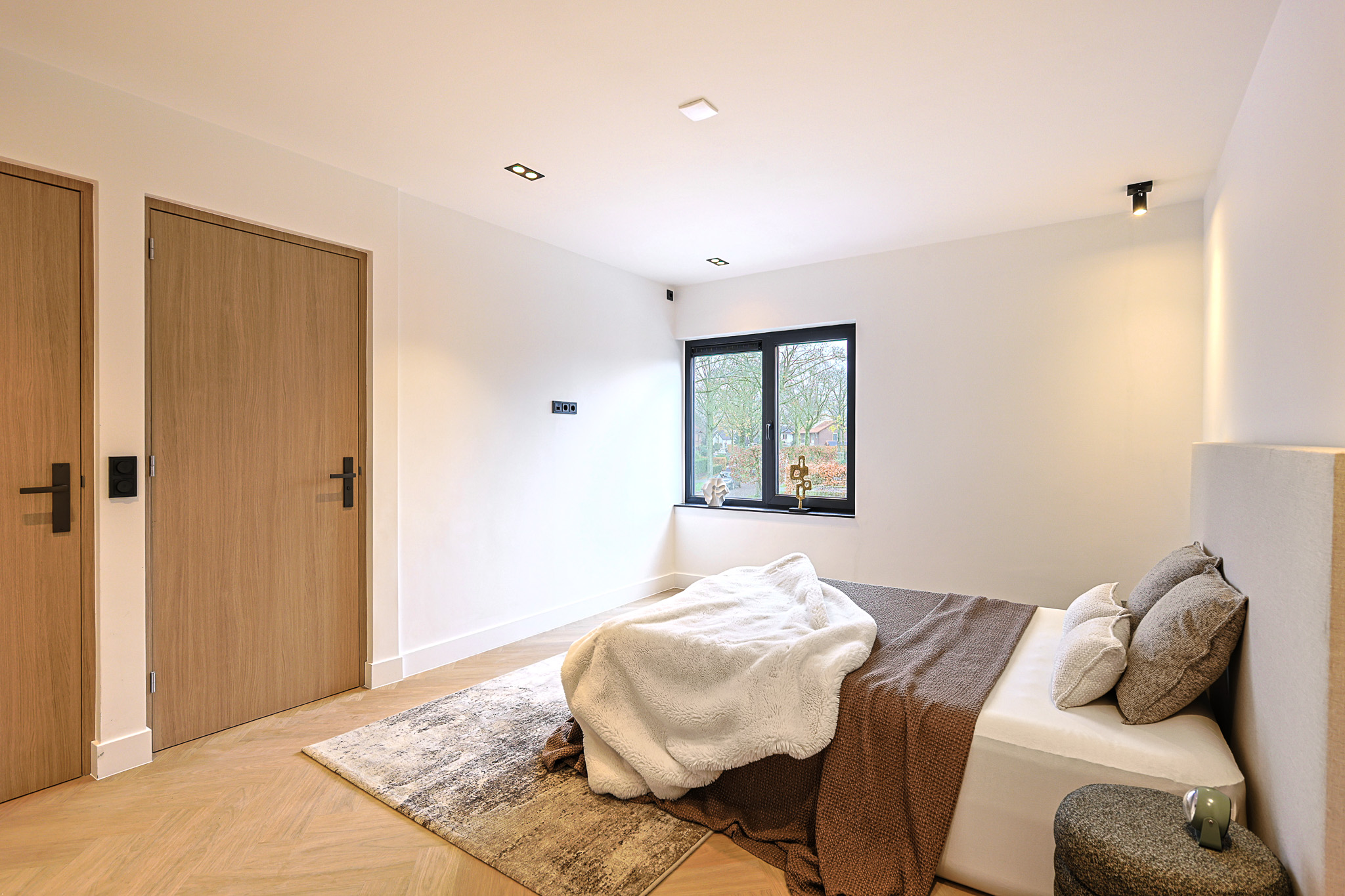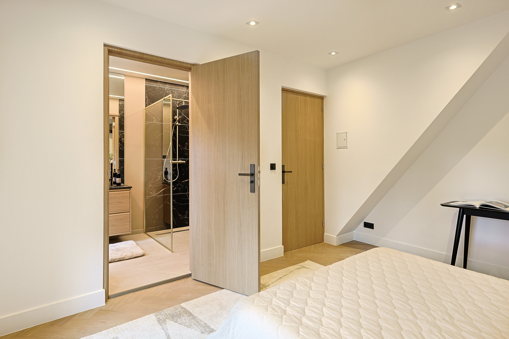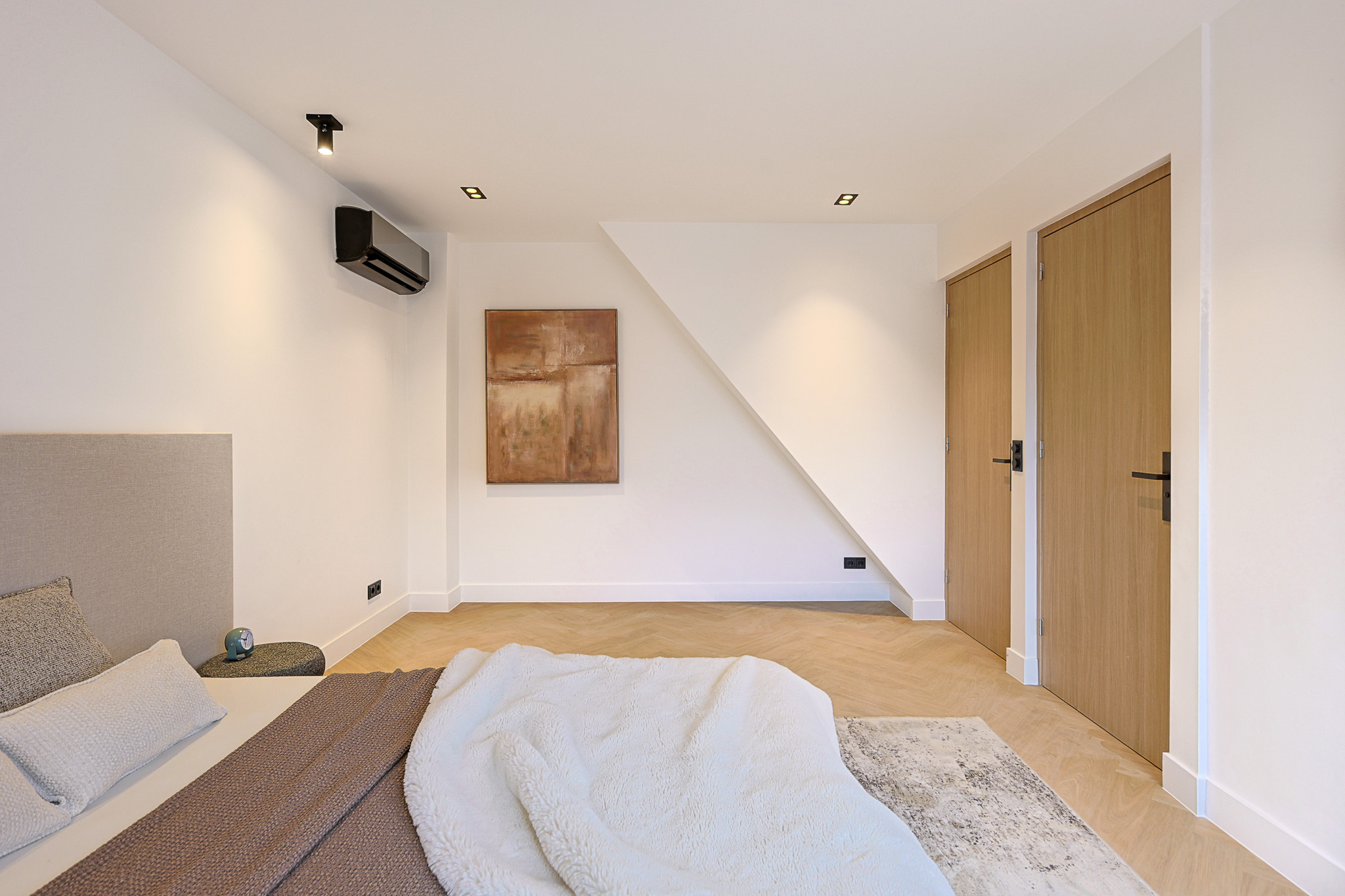 Grote slaapkamer met airco (koelen én verwarmen), inbouwverlichting en toegang tot de tweede badkamer, die tevens vanaf de overloop te bereiken is.