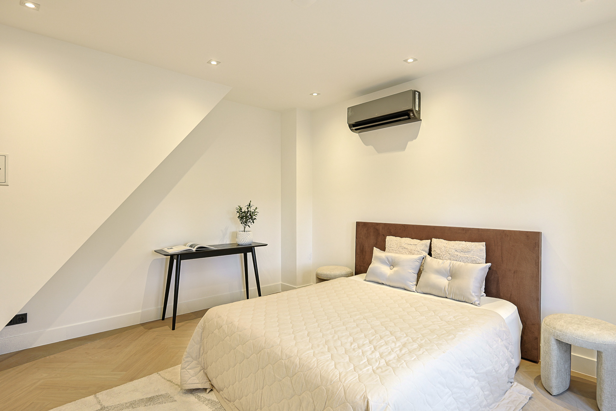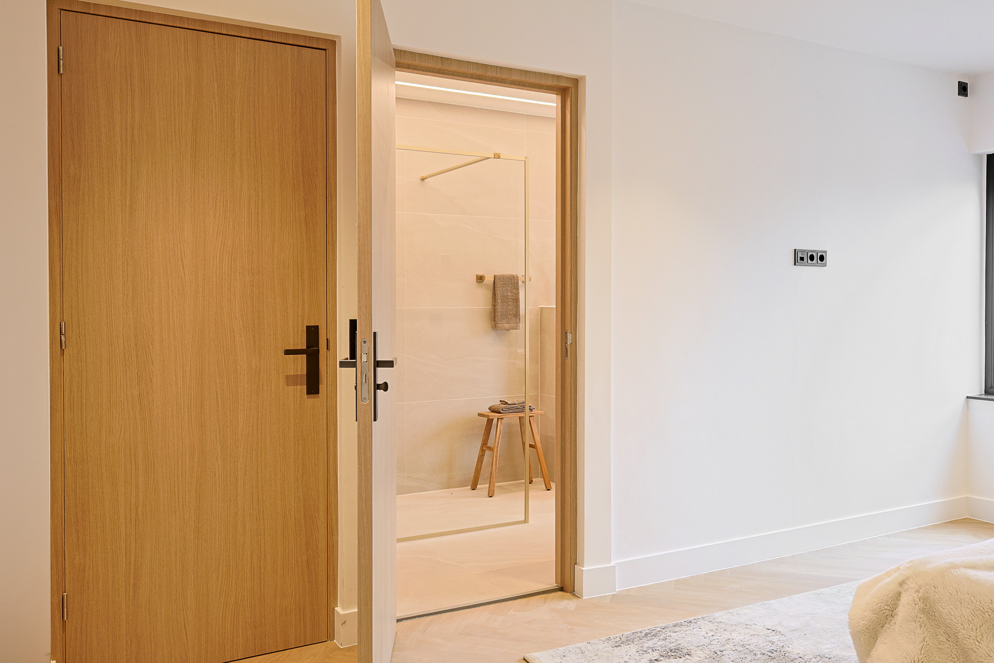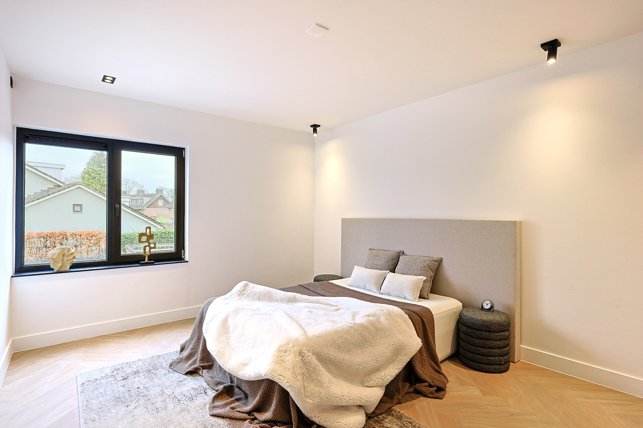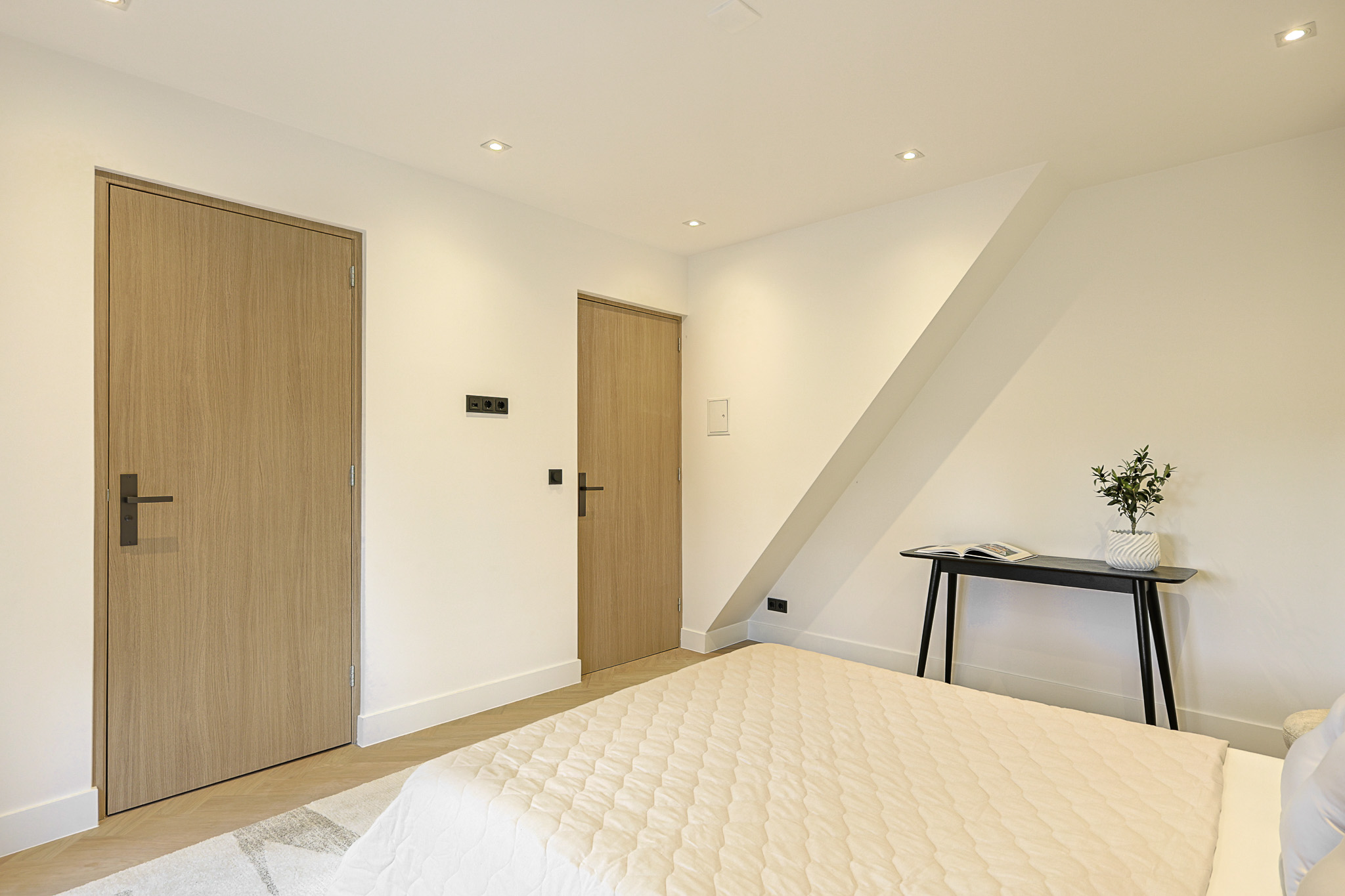 Grote slaapkamer met airco (koelen én verwarmen), inbouwverlichting en toegang tot de tweede badkamer, die tevens vanaf de overloop te bereiken is.