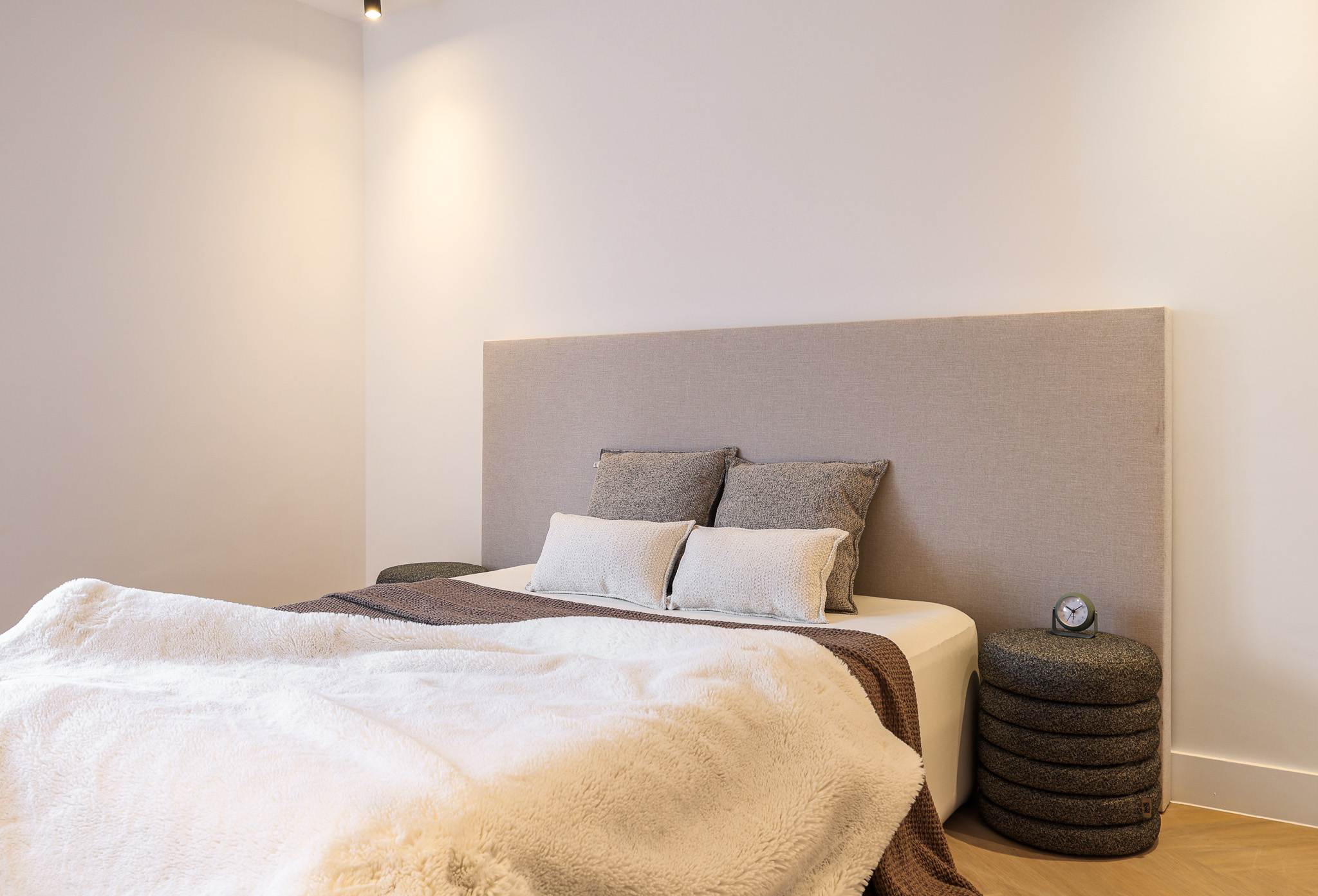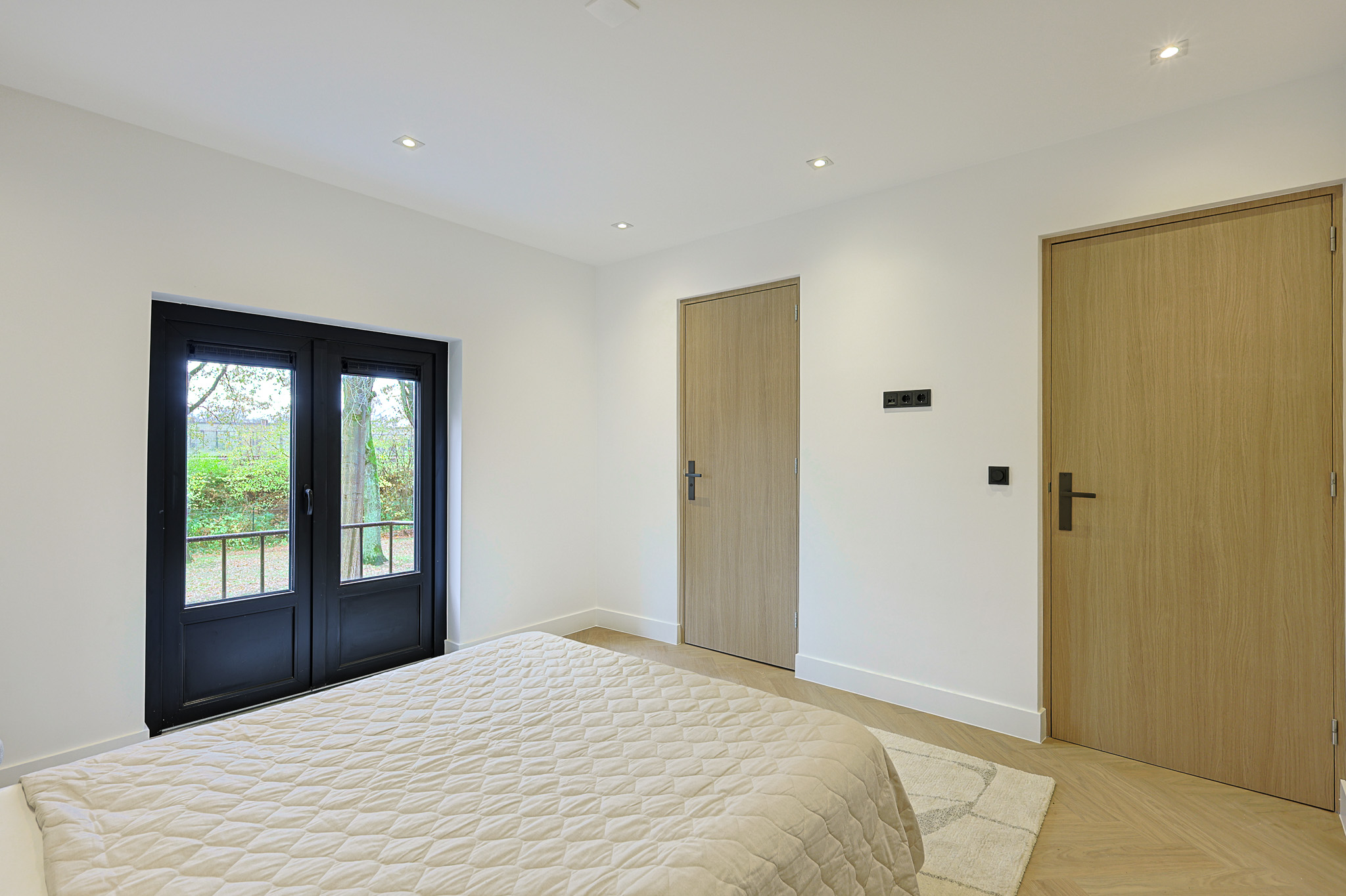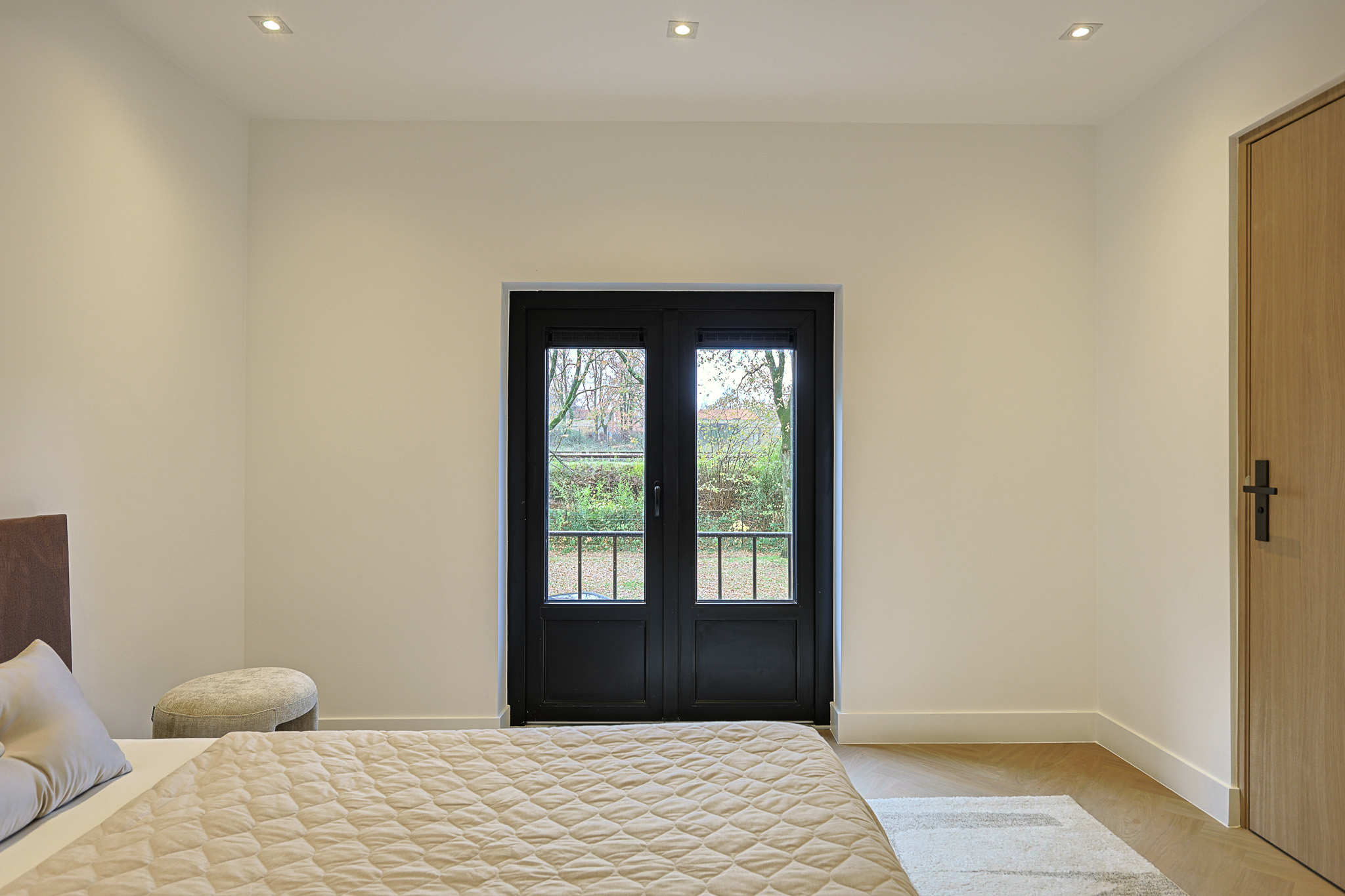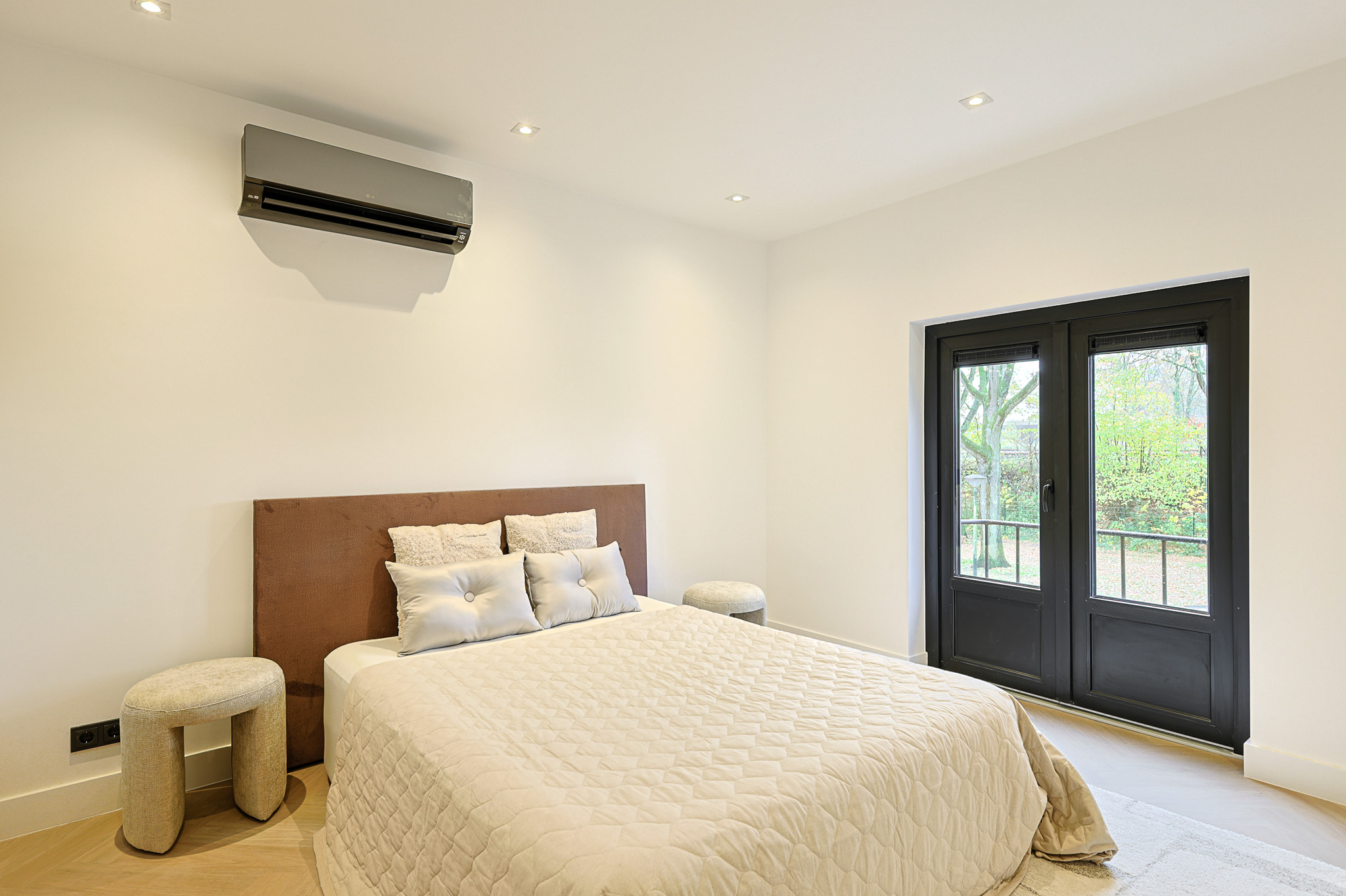 Ruime slaapkamer met airco (koelen én verwarmen), inbouwverlichting en openslaande deuren naar het balkon. De kamer heeft directe toegang tot de eerste badkamer.
