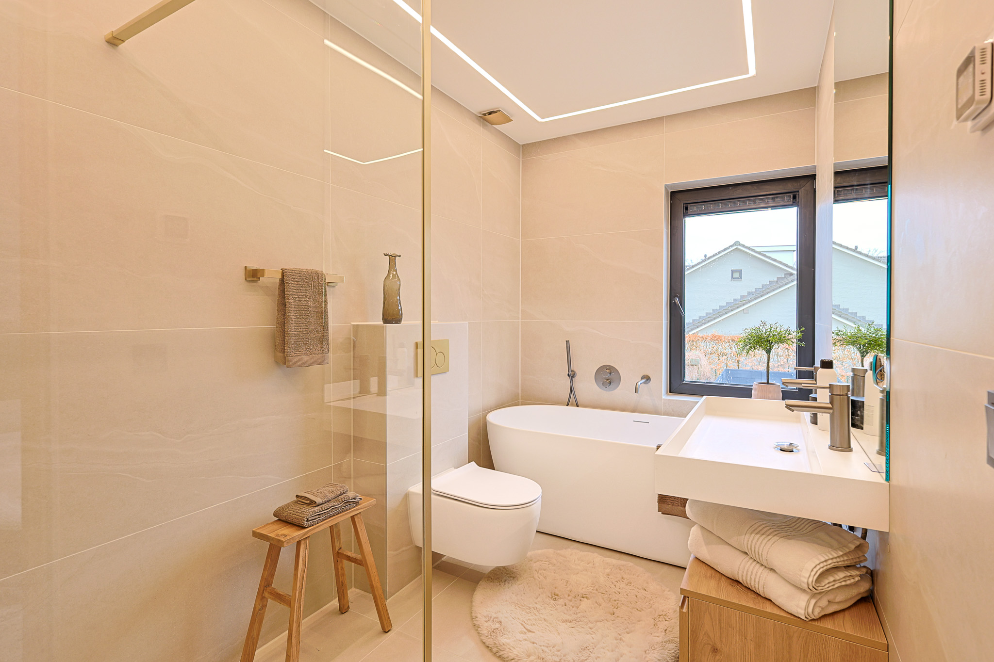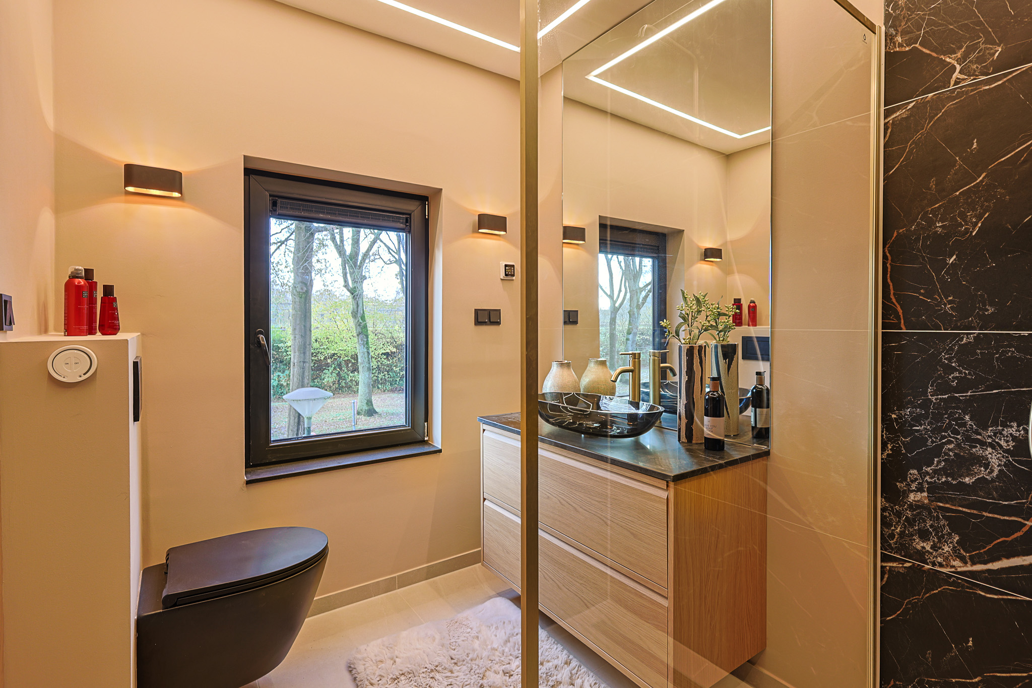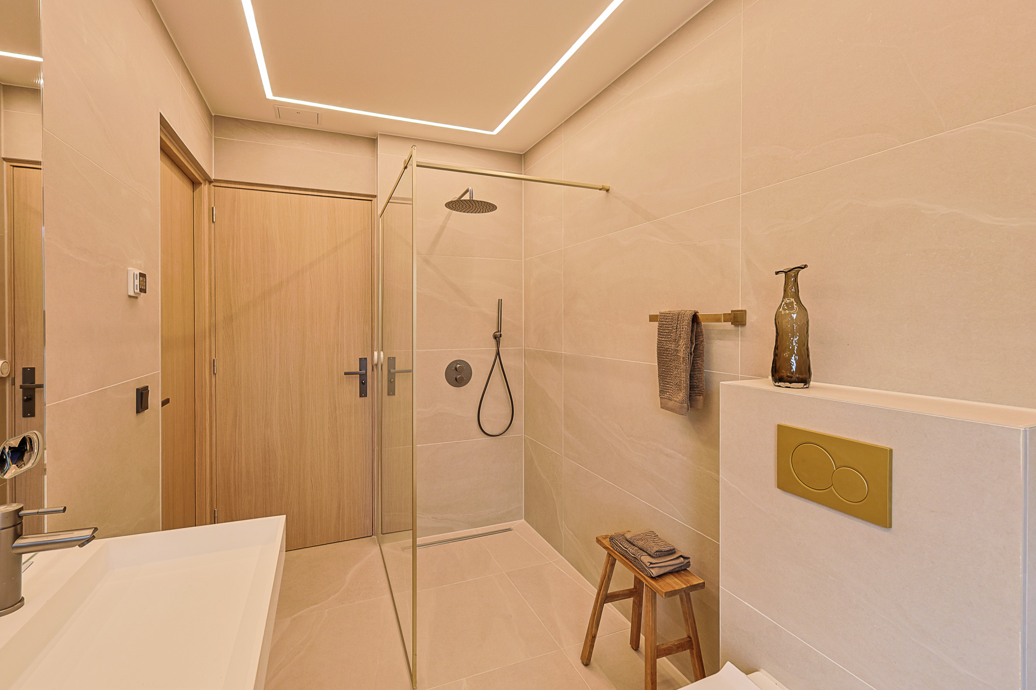 Luxe en moderne badkamer met lichtstrip in het plafond, inloopdouche, wastafelmeubel en hangcloset. Daarnaast is hier vloerverwarming aanwezig.