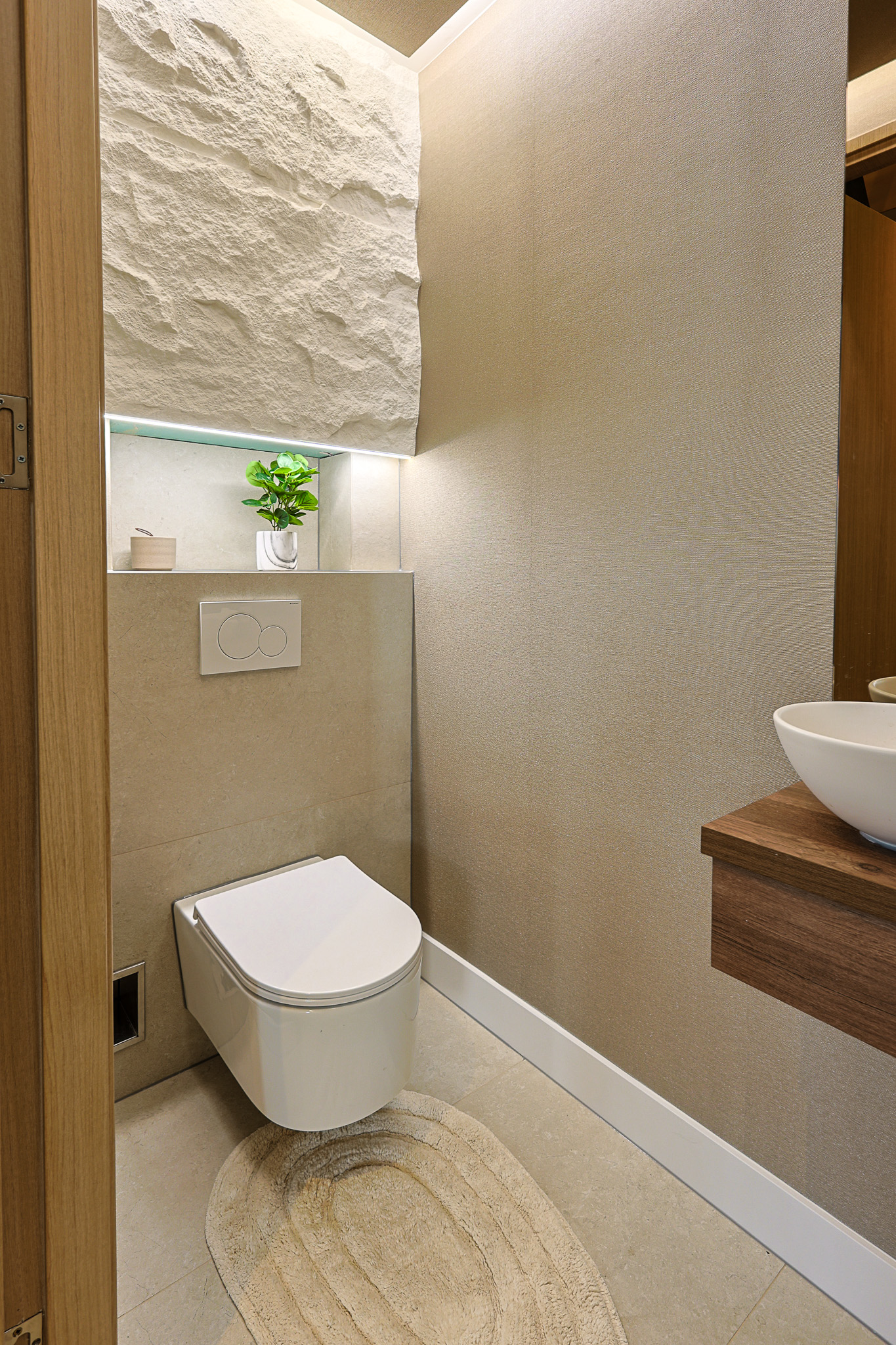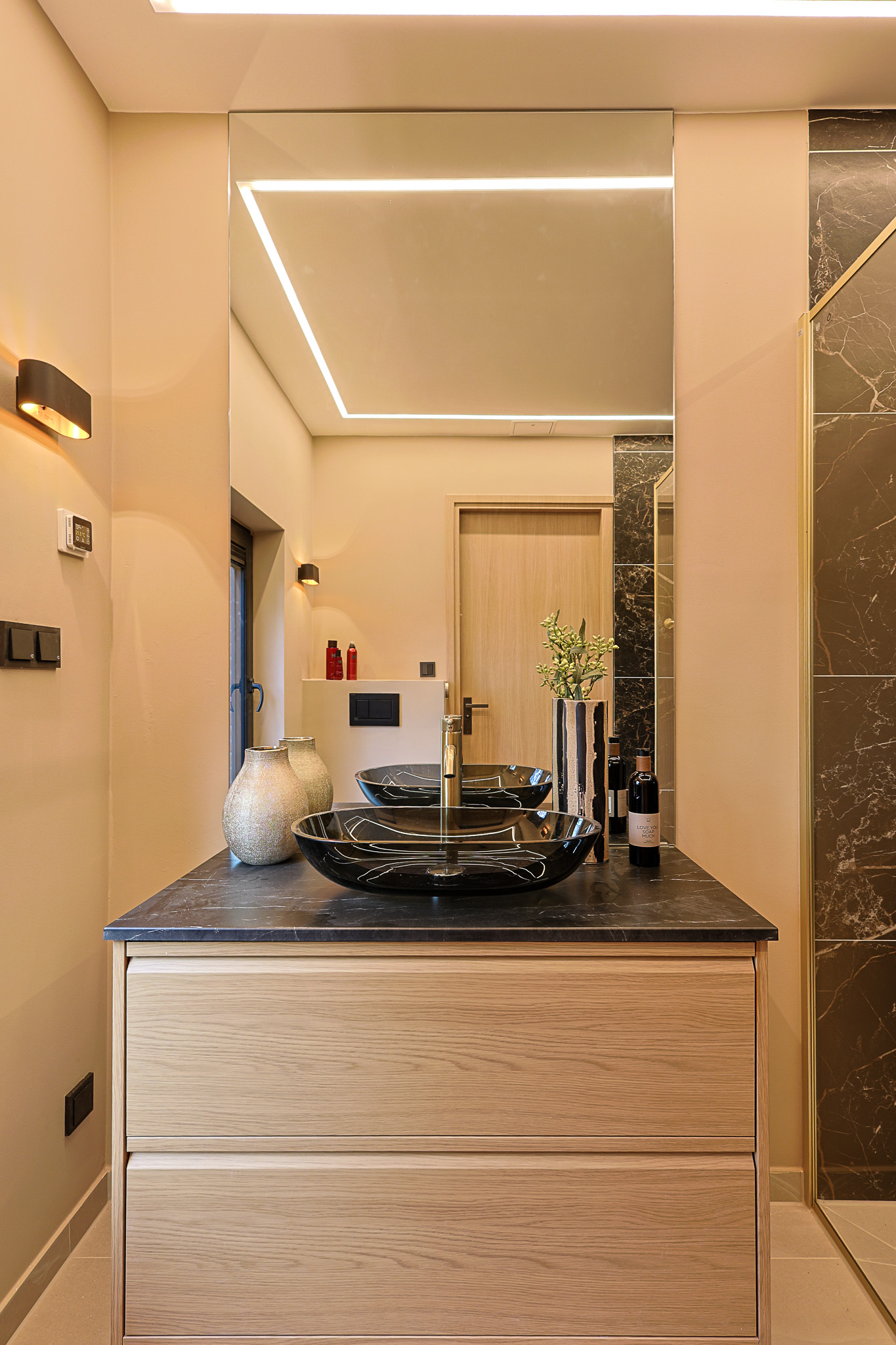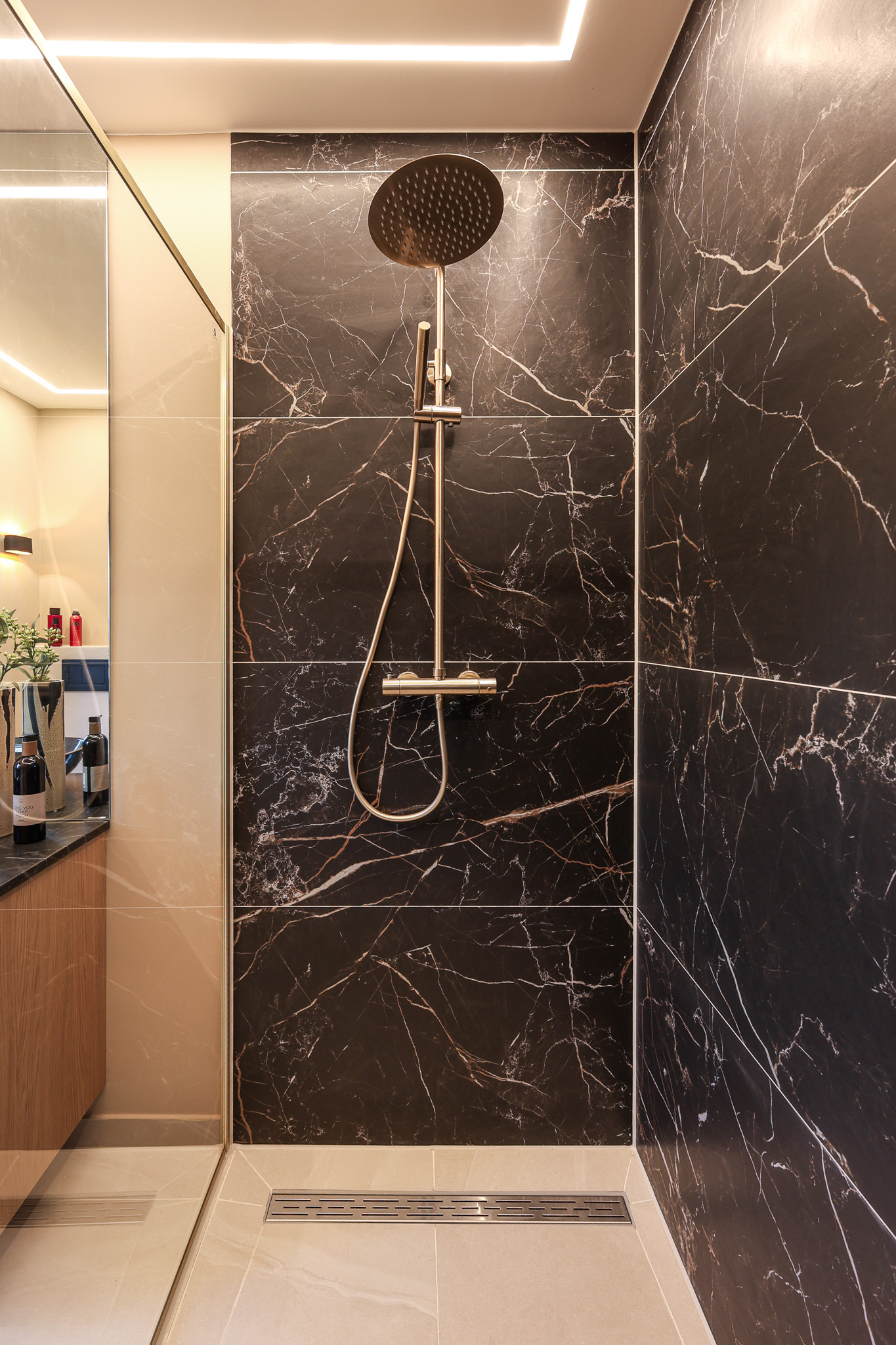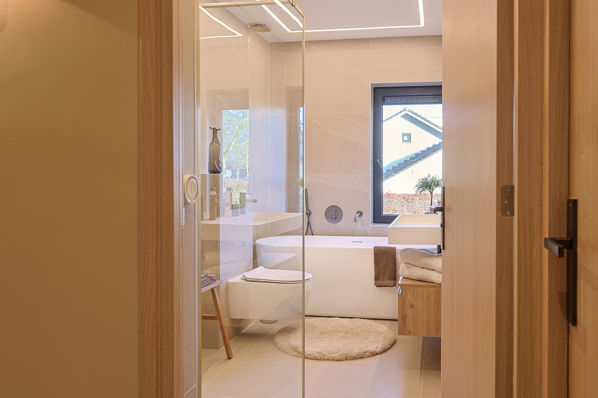 Luxe en moderne badkamer met lichtstrip in het plafond, inloopdouche, wastafelmeubel en hangcloset. Daarnaast is hier vloerverwarming aanwezig.