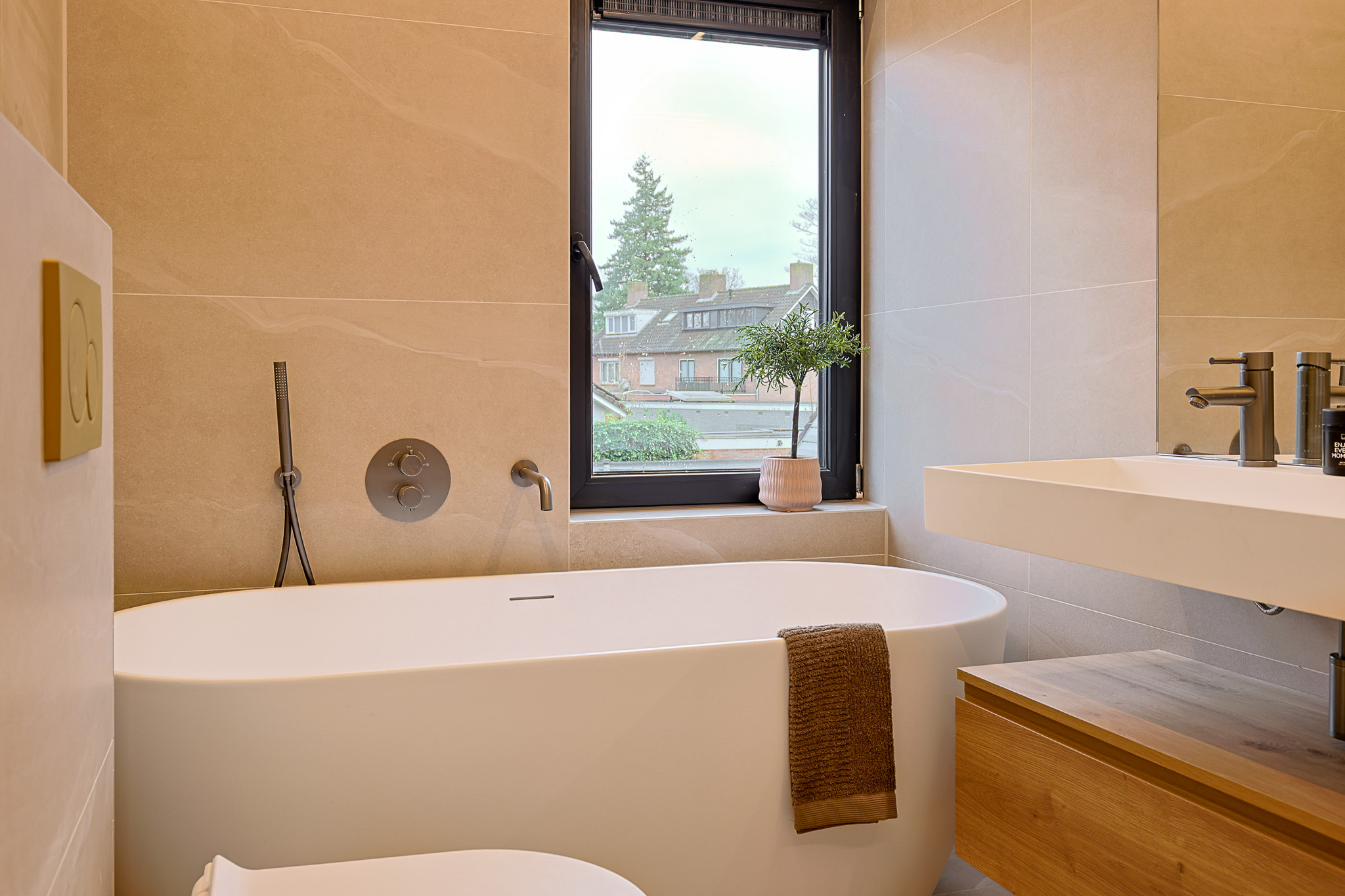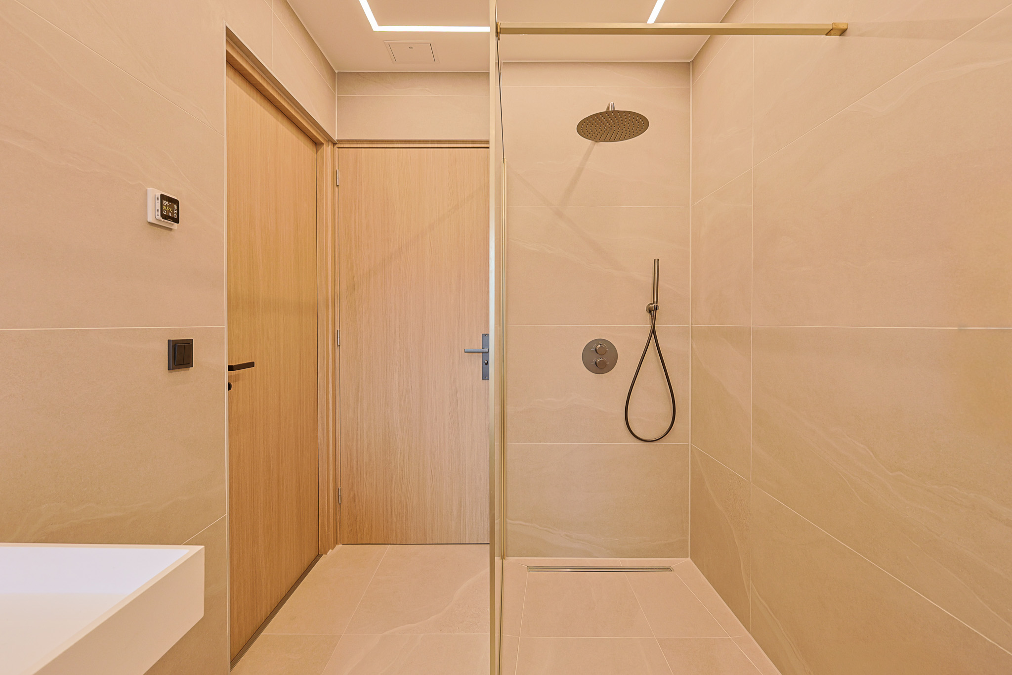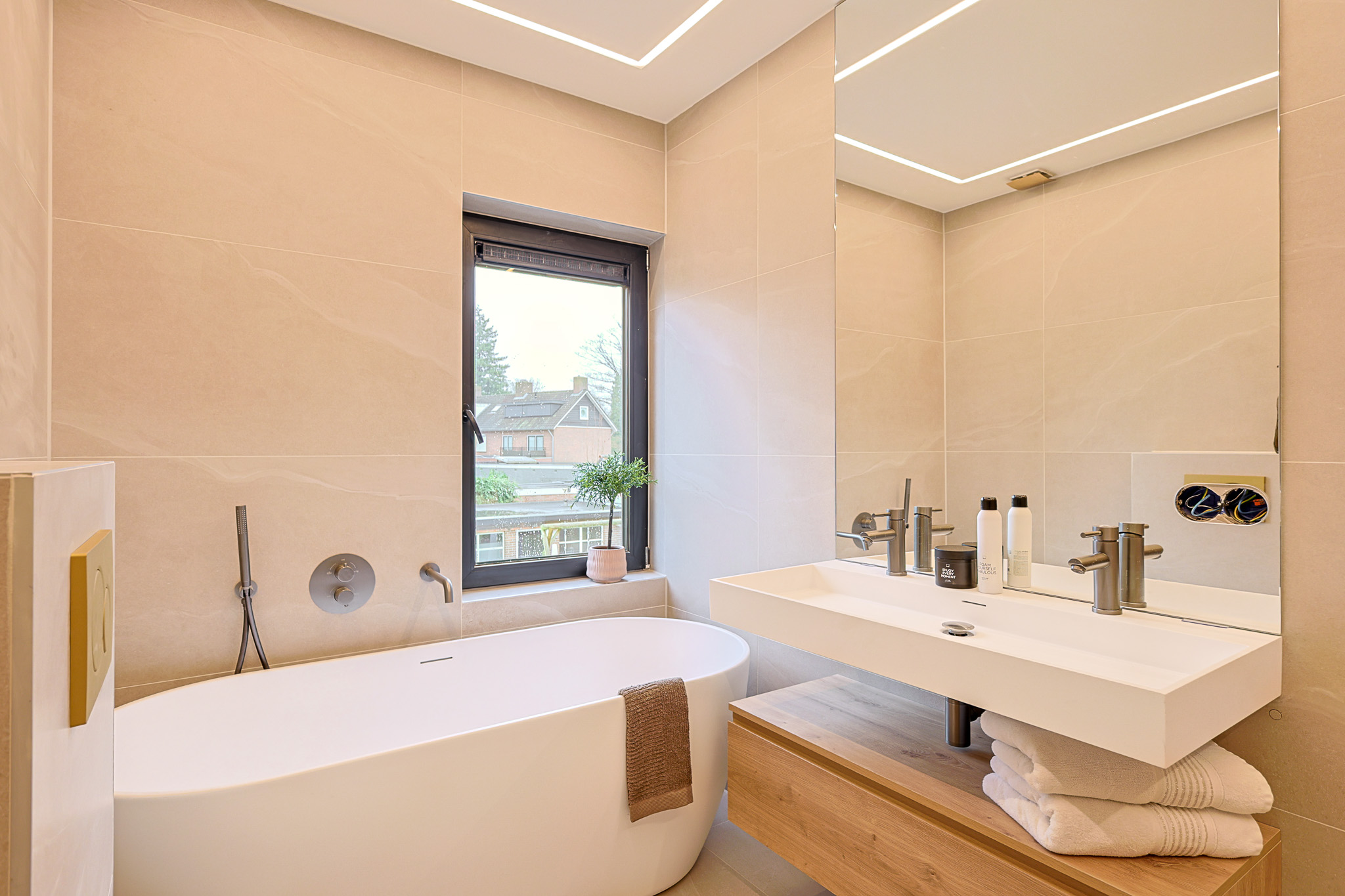 Een lichte en ruim opgezette badkamer met inloopdouche, ligbad, hangcloset en plafondverlichting. Daarnaast is hier vloerverwarming aanwezig.