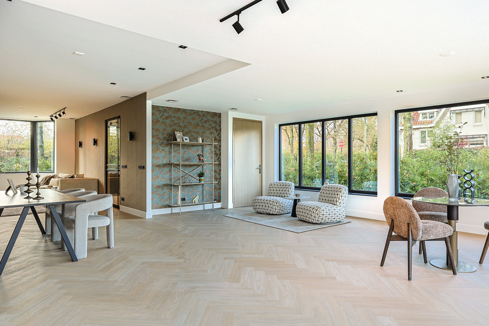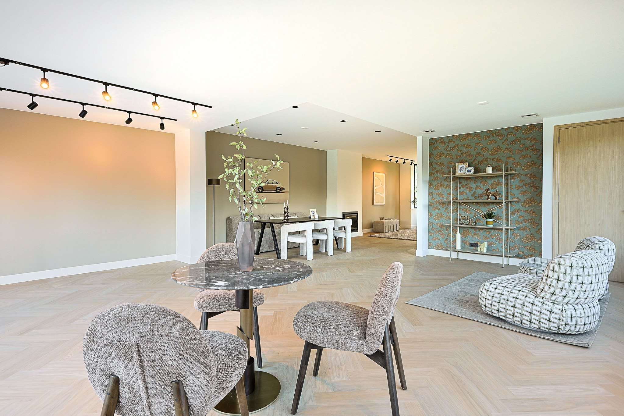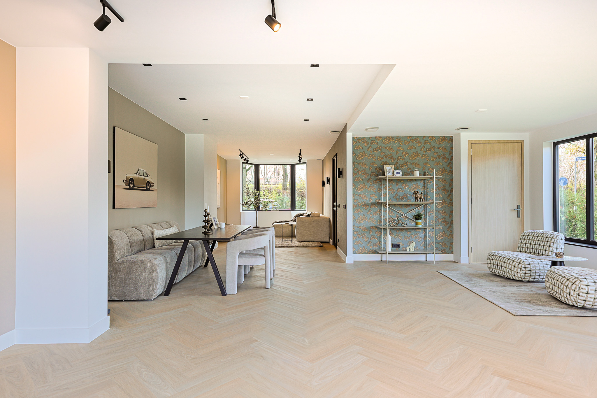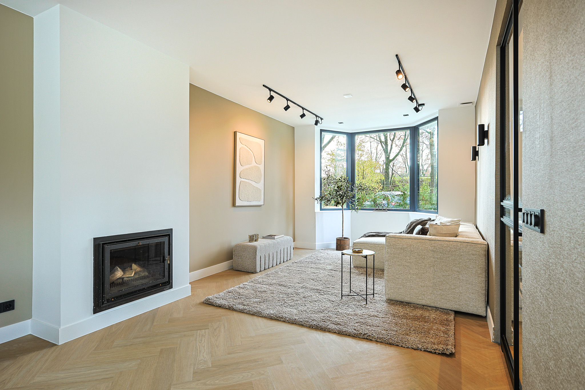 De royale woonkamer heeft een luxe en warme uitstraling, mede dankzij de erker aan de voorzijde en de sfeervolle verlichting. De houtkachel vormt een mooi middelpunt van de ruimte. De kamer loopt door in het eetgedeelte en de riante aanbouw waar de keuken kan worden geplaatst, ideaal voor een royale leefkeuken.