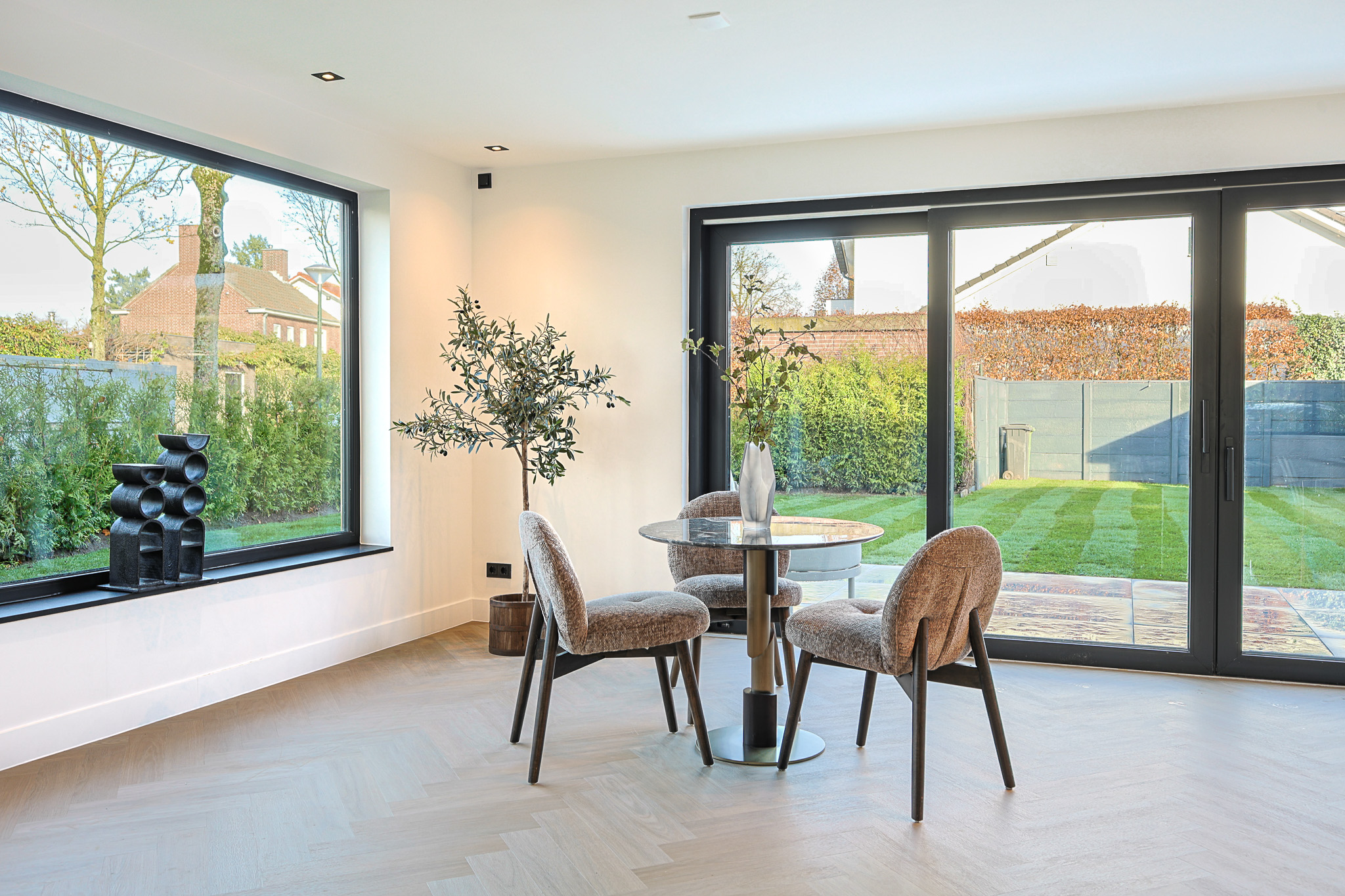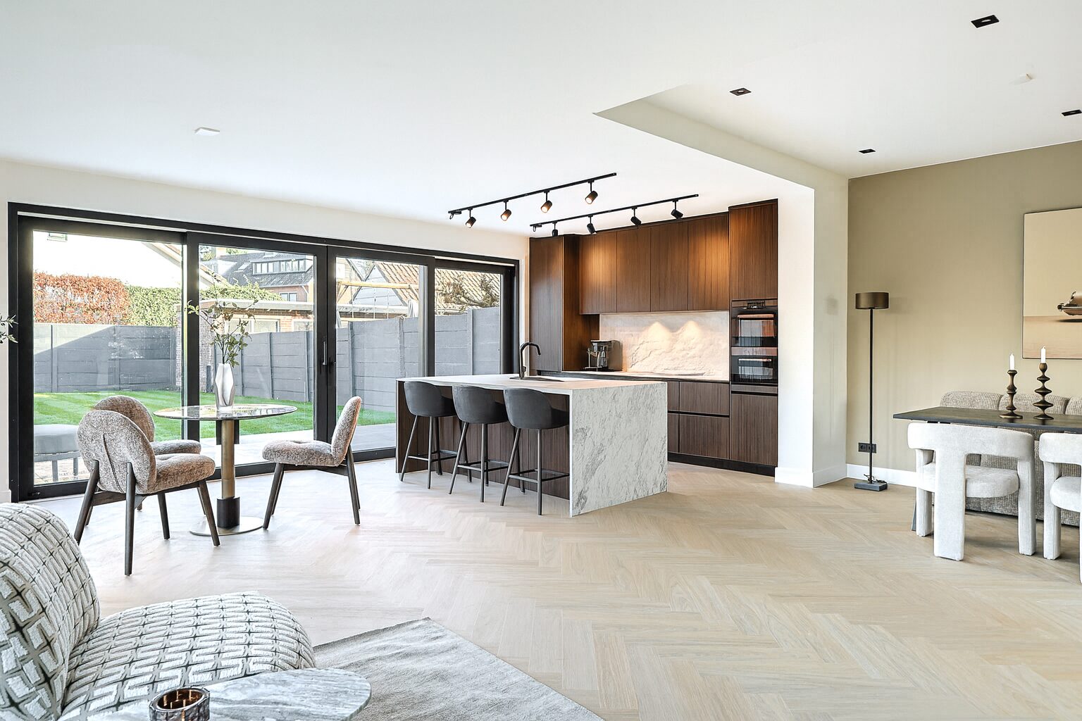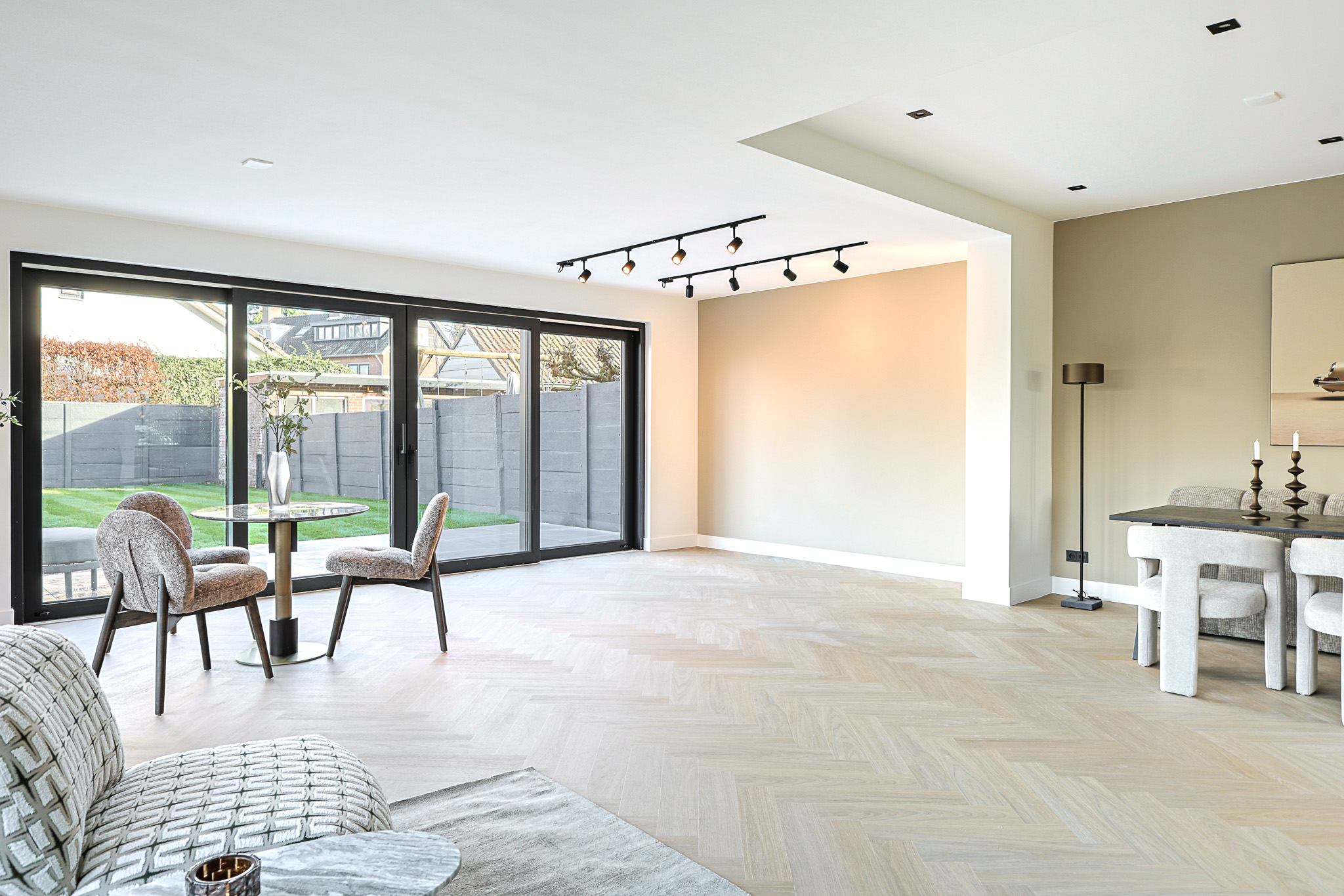 In de aanbouw is ruimte gecreëerd voor een ruime, moderne leefkeuken. Dankzij de grote schuifdeuren en vele ramen geniet je hier van een prachtig zicht op de net aangelegde tuin. Alle aansluitingen voor de keuken zijn al aanwezig, waardoor kopers hier volledig hun eigen droomkeuken kunnen realiseren.