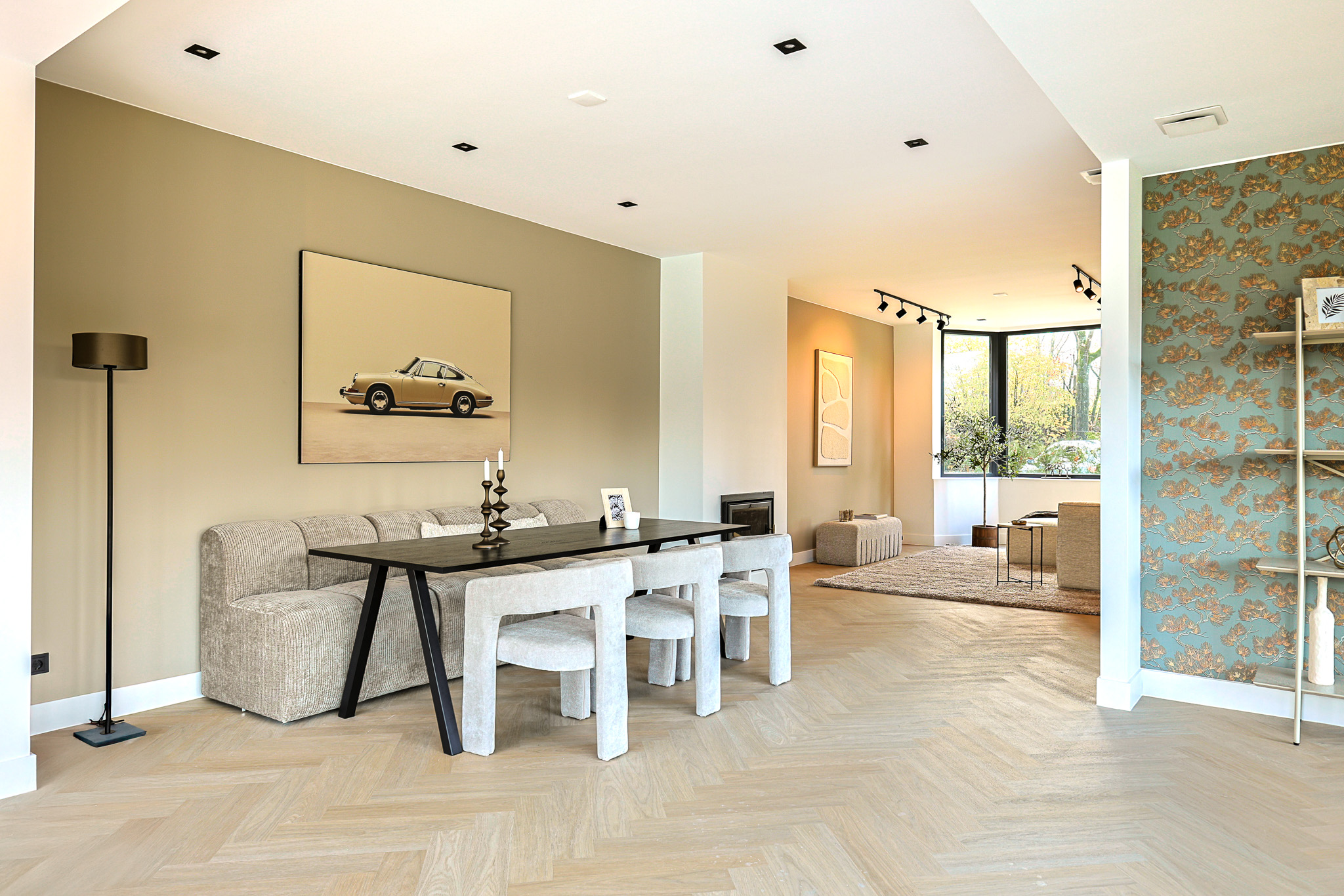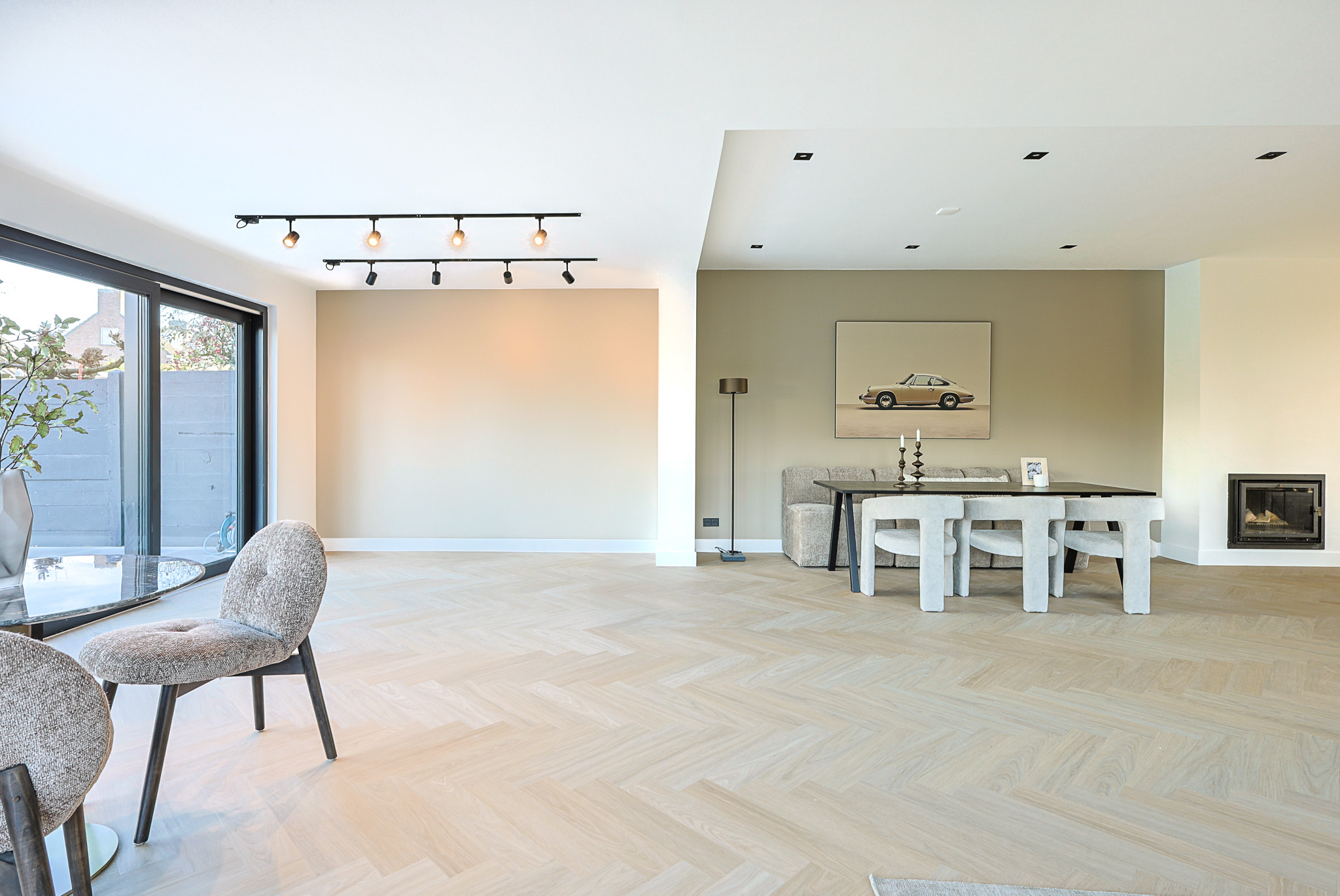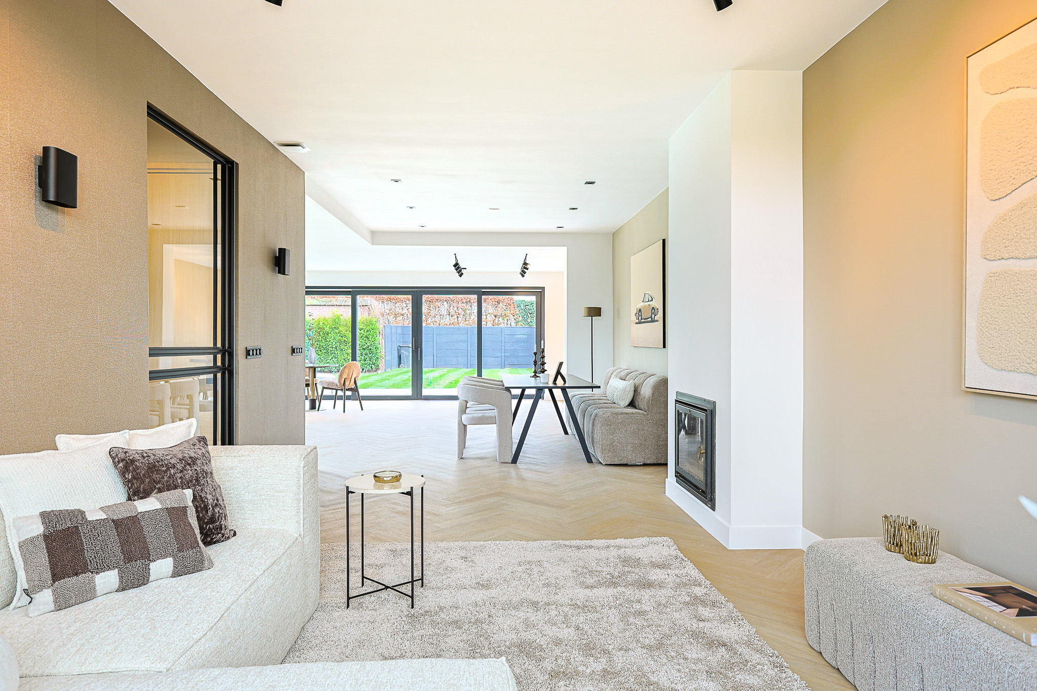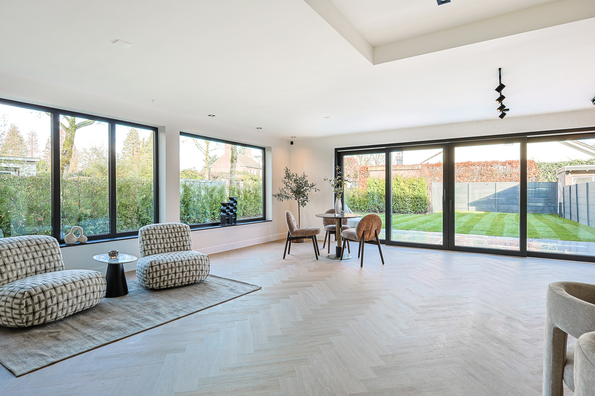 In de aanbouw is ruimte gecreëerd voor een ruime, moderne leefkeuken. Dankzij de grote schuifdeuren en vele ramen geniet je hier van een prachtig zicht op de net aangelegde tuin. Alle aansluitingen voor de keuken zijn al aanwezig, waardoor kopers hier volledig hun eigen droomkeuken kunnen realiseren.