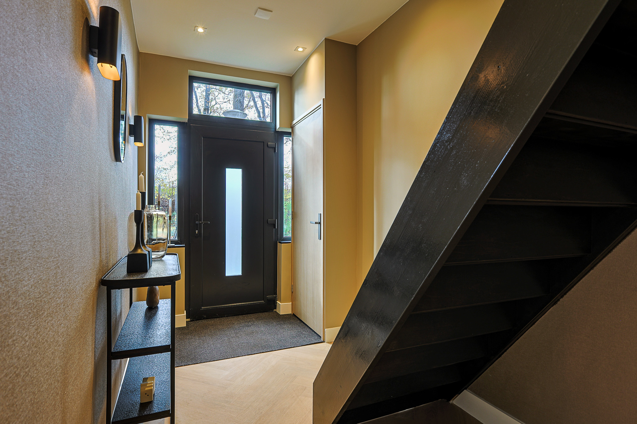 Via de verzorgde voortuin stap je binnen in een ruime en luxe hal met wandverlichting en een prachtige pvc-visgraatvloer die doorloopt door de gehele woning. Vanuit hier heb je toegang tot het moderne toilet, de trap naar de eerste verdieping en de woonkamer. De woonkamer bereik je via een stijlvolle glazen deur.
