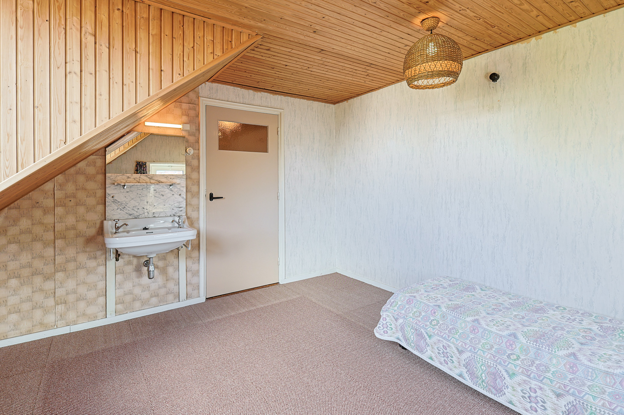 De overloop op de eerste verdieping geeft toegang tot drie slaapkamers en de oorspronkelijke badkamer. De ouderslaapkamer bevindt zich aan de achterzijde van de woning en biedt voldoende ruimte voor een tweepersoonsopstelling en een ruime kast. De tweede slaapkamer aan de voorzijde is eveneens ruim. De derde slaapkamer aan de voorzijde is compacter en leent zich uitstekend als kinderkamer of kleedruimte. De badkamer op deze verdieping is functioneel ingericht met een bad een vaste wastafel en de aansluiting voor wasapparatuur.