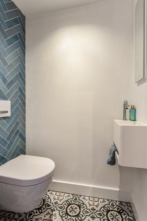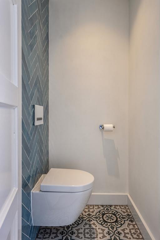 Zeer ruimte toiletruimte met hangcloset (Villeroy en Boch) en fonteintje. De achterwand van het toilet is afgewerkt met een fraaie tegel en glazen drukplaat. Daarnaast is het toilet voorzien van mechanische ventilatie.