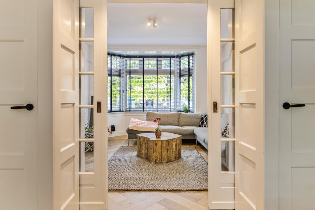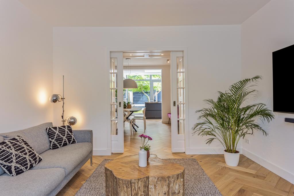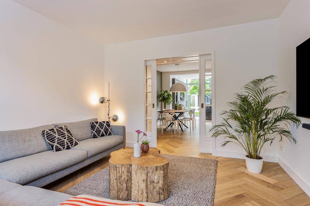 De ruime woonkamer is gelegen aan de voorzijde van de woning. De woonkamer is voorzien van veel natuurlijk lichtinval dankzij de erker met authentieke glas-in-lood ramen. De woonkamer heeft een eikenhouten visgraatvloer met vloerverwarming, welke is doorgelegd over de gehele benedenverdieping en is afgewerkt met 12 cm hoge plinten. De woonkamer is te scheiden van de eetkamer middels de ensuite deuren voorzien van inbouwspots. In elke hoek van de woonkamer is een dubbel stopcontact aanwezig.