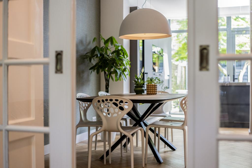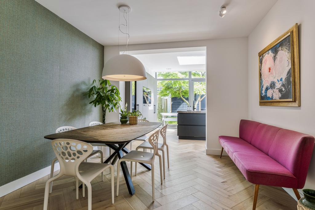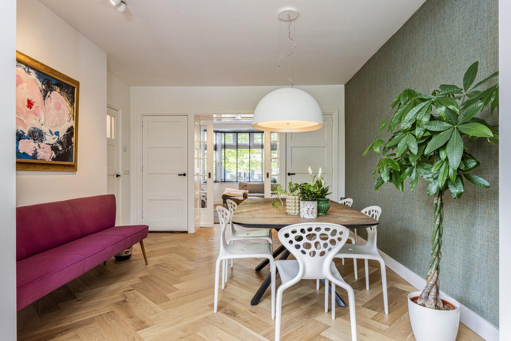 De ruim opgezette eetkamer is gepositioneerd tussen woonkamer en keuken. Een van de wanden is stijlvol afgewerkt met vinylbehang. In de eetkamer is voldoende ruimte voor een grote eettafel, opbergruimte is afdoende aanwezig dankzij twee inbouwkasten.