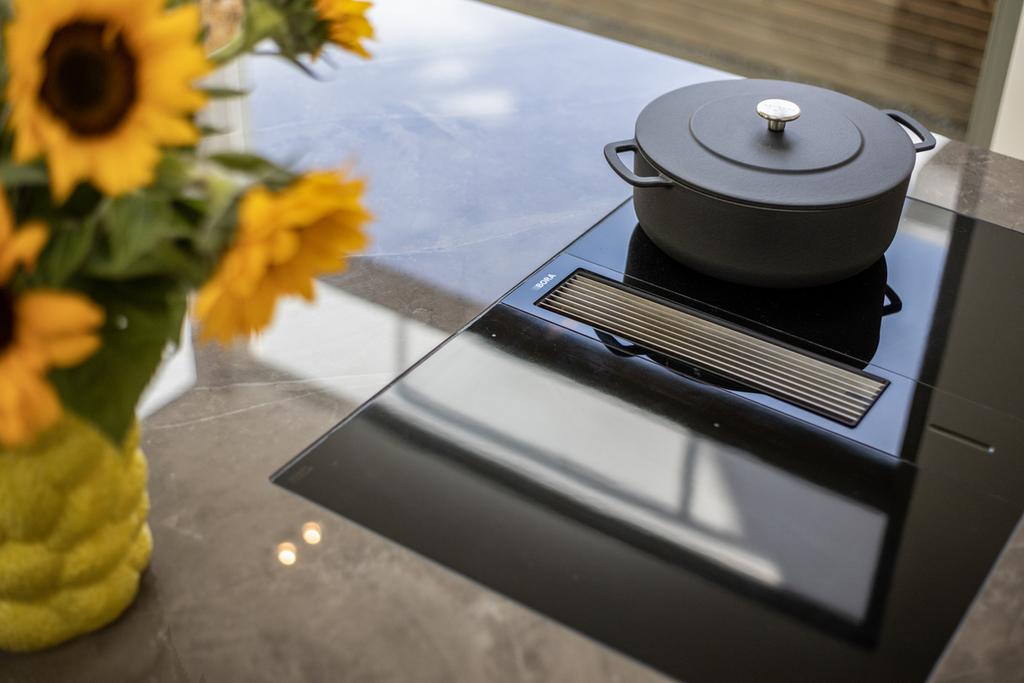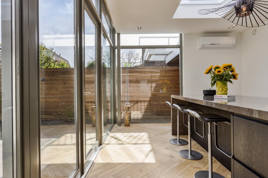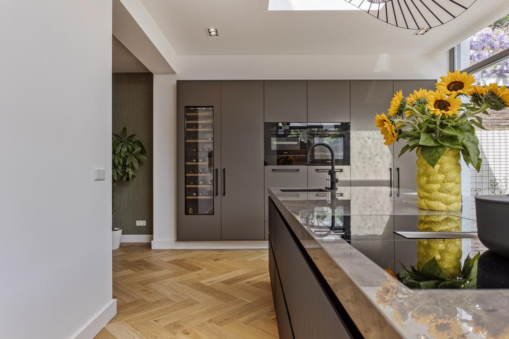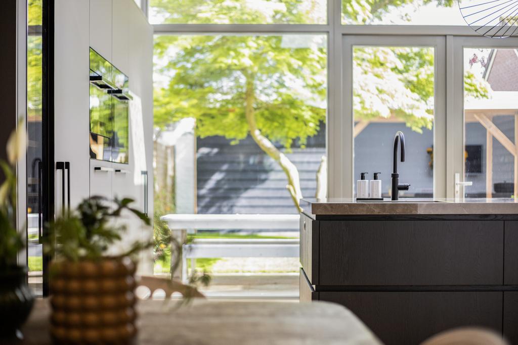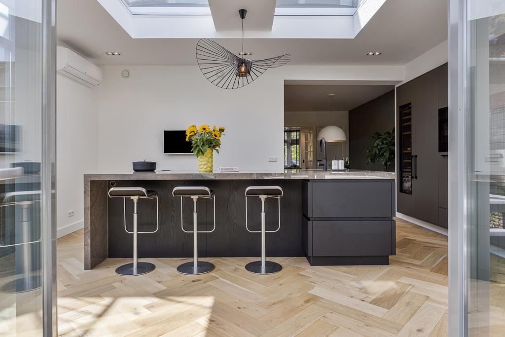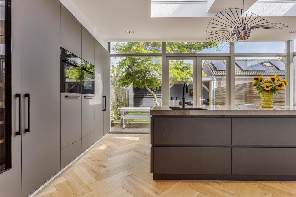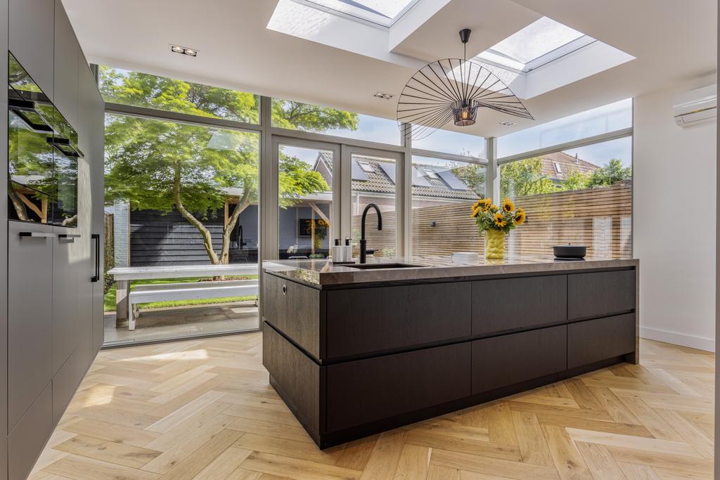 De open, ruim opgezette en op maat gemaakte keuken (CoKoen interieurmaatwerk) staat in open verbinding met de eetkamer en is voorzien van veel natuurlijk lichtinval. De keuken is van alle gemakken en moderne apparatuur voorzien en heeft een ruime opzet dankzij de grote kastenwand en het kookeiland. De kastenwand is o.a. voorzien van een Liebher klimaatkast, inbouwvriezer met 3 laden, koelkast (volledige hoogte) met 3 vershoud lades, inbouwapparatuur van Miele, waaronder: combi stoomoven met vaste water af- en toevoer warmhoud lade, oven die beschikt over 5 lagen met camerafunctie en vaatwasser op hoogte. De kastenwand beschikt over ruim voldoende opbergruimte met onder andere een uitschuifbaar plateau met stroom die ideaal zou dienen als koffiecorner en diverse lades/opbergruimte. Het kookeiland is onder andere voorzien van een Quooker met uitneembare slang, een Bora inductiekookplaat met afzuiging, barfunctie met ruimte voor drie barkrukken en is afgewerkt met een Dekton werkblad. De keuken is daarnaast voorzien van twee grote Velux lichtkoepels, openslaande deuren naar de tuin, tv-aansluiting en een LG Dual Airco.