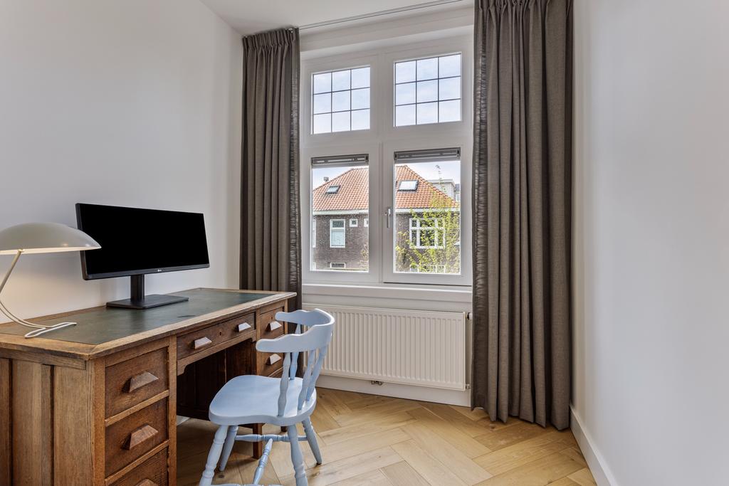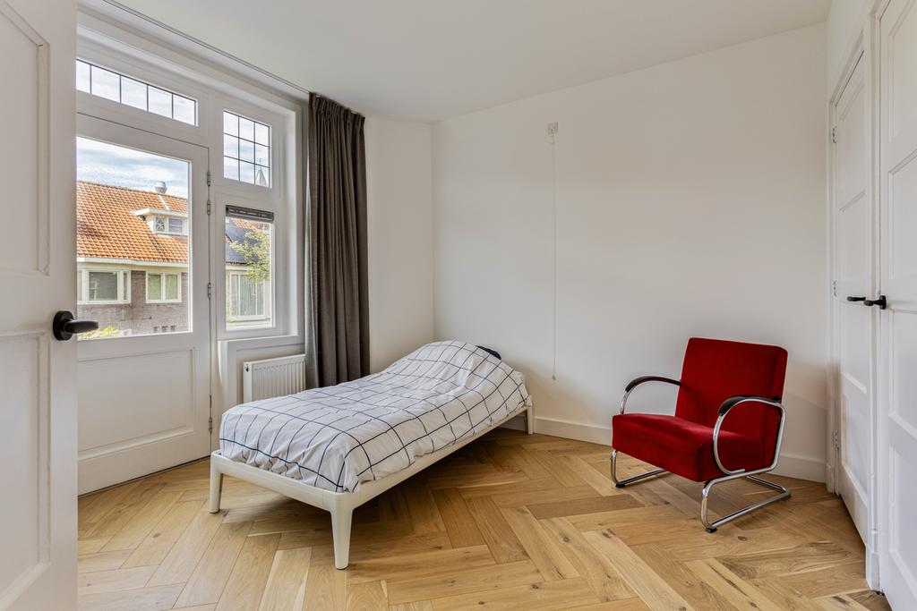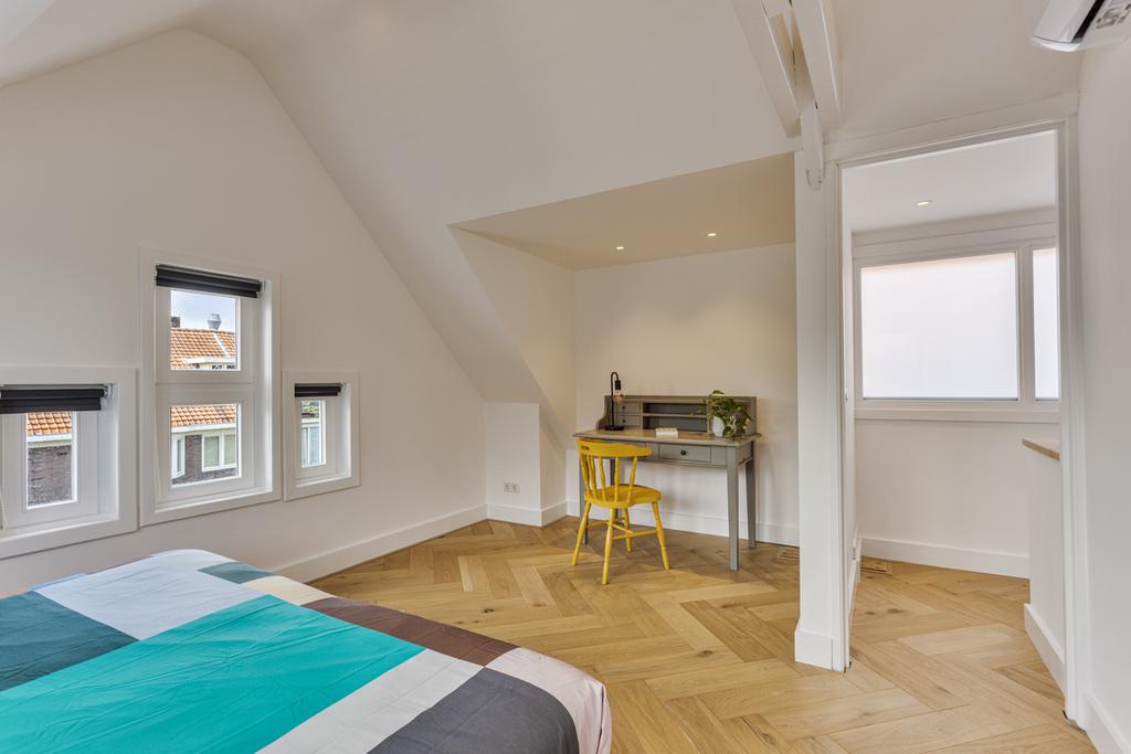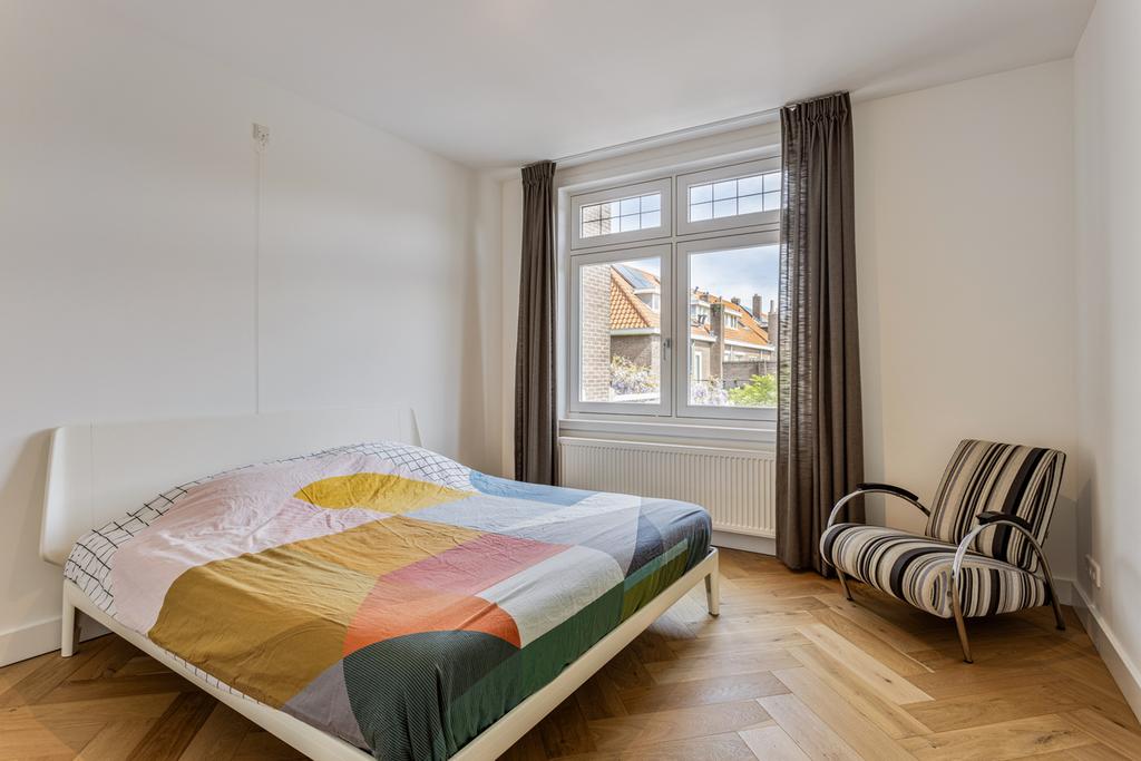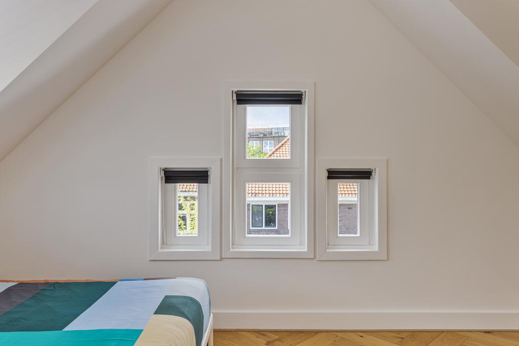 Lichte, ruime slaapkamer gelegen aan de achterzijde van de woning voorzien van een draai-/kiepraam, met karakteristieke isolerende glas-in-lood beglazing, voldoende stopcontacten en twee ruime inbouwkasten.