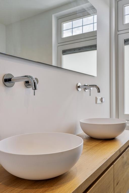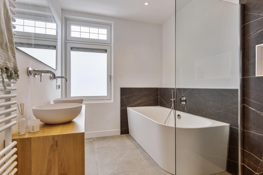 De gedeeltelijk betegelde, ruime badkamer voorzien van een dubbele wastafel met een maatwerk eiken ombouwmeubel, groot ligbad dat wordt gevuld vanuit de badoverloop, inloopdouche, elektrische vloerverwarming en designradiator. Alle (inbouw)kranen zijn van het Italiaanse merk Hotbath. De badkamer is daarnaast ook voorzien van een groot draai-/kiepraam met gematteerd glas en daarboven isolerende authentieke glas-in-lood beglazing. De badkamer is tevens voorzien van mechanische afzuiging.