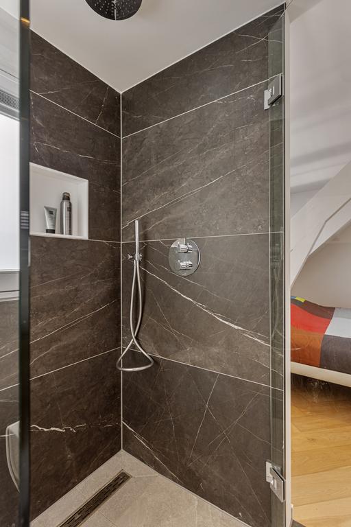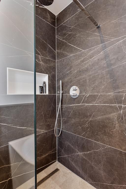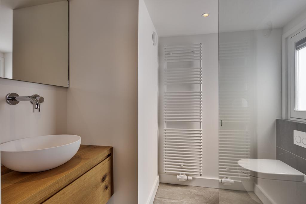 Vanuit de ouderslaapkamer heeft u direct toegang tot de ensuite badkamer. De badkamer is voorzien van elektrische vloerverwarming, een hangcloset (Villeroy en Boch), een wastafel met maatwerk eiken ombouwmeubel, designradiator en inloopdouche met glaswand. Alle (inbouw)kranen zijn van het Italiaanse designmerk Hotbath. De badkamer is daarnaast voorzien van een draai-/kiepraam met gematteerd glas en mechanische afzuiging.