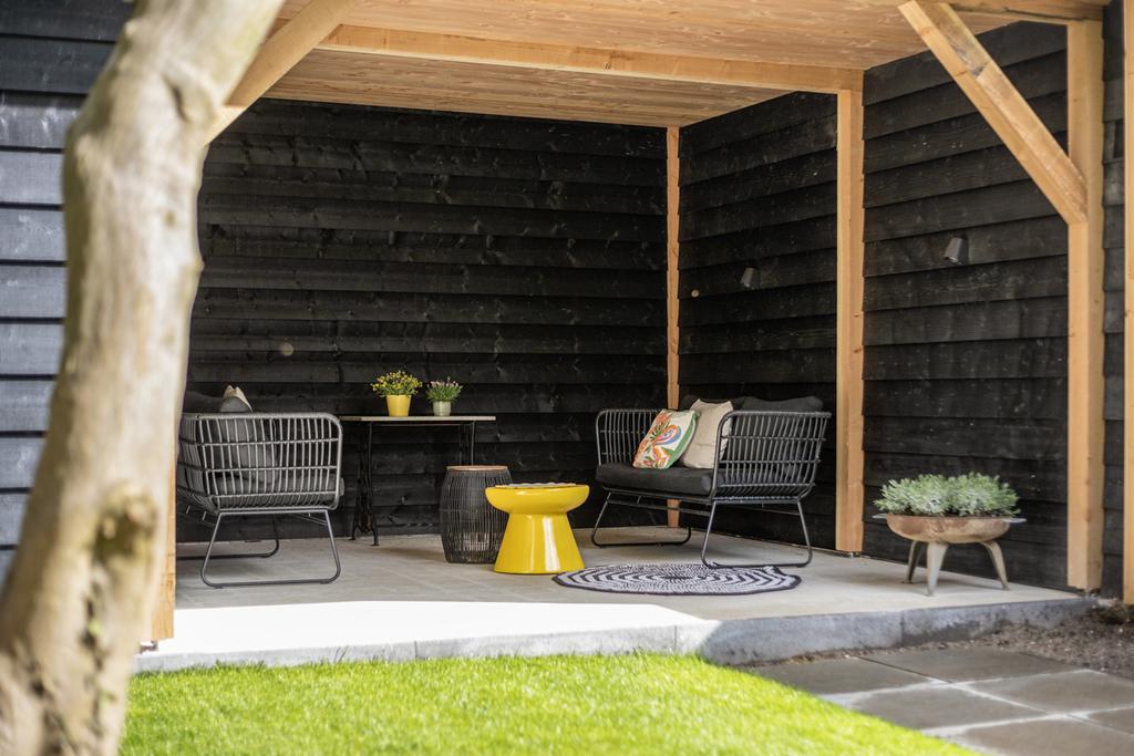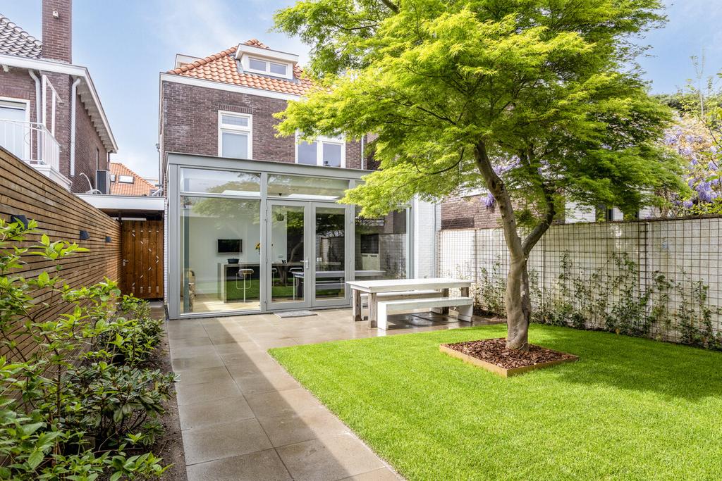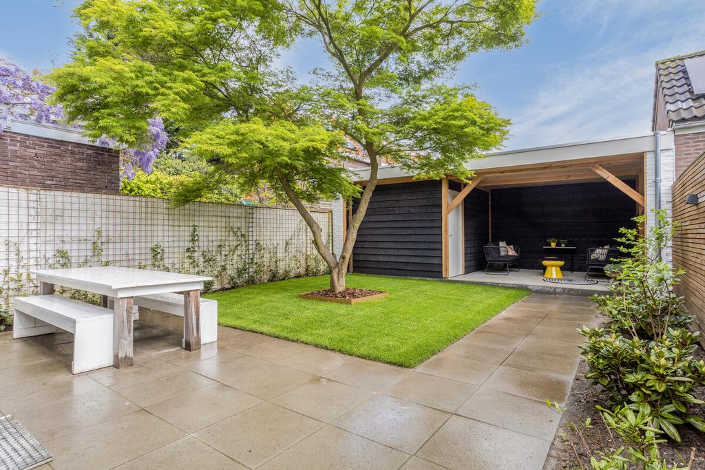 De tuin gelegen op het zuidoosten is voorzien van een tweetal terrassen waarvan een overdekt. De tuin heeft een moderne afwerking met tegels, gazon, groenborders en tuinverlichting. Achterin de tuin bevindt zich een overdekt terras en de berging met daarop 9 zonnepanelen. De woning heeft een eigen achterom.