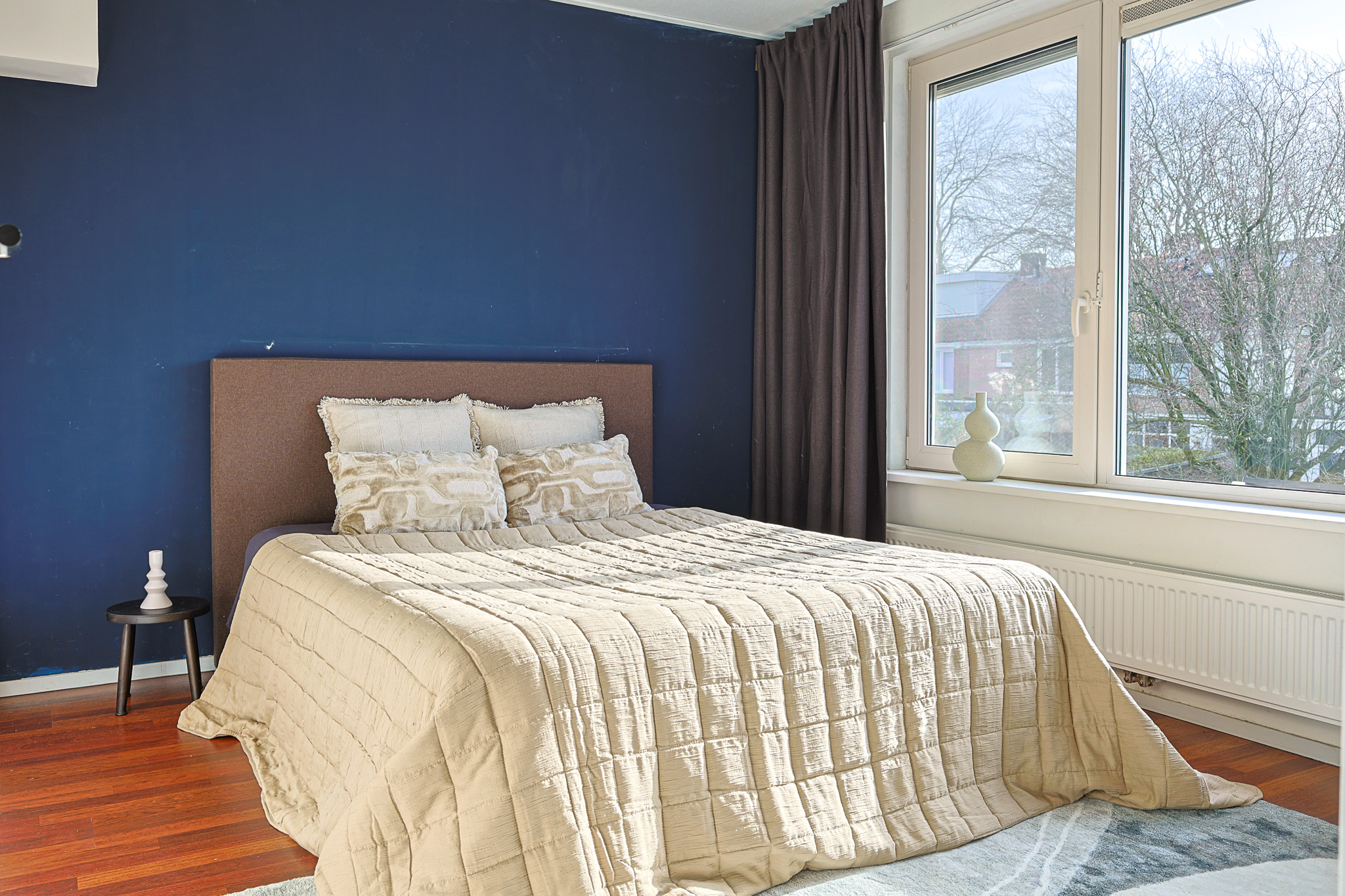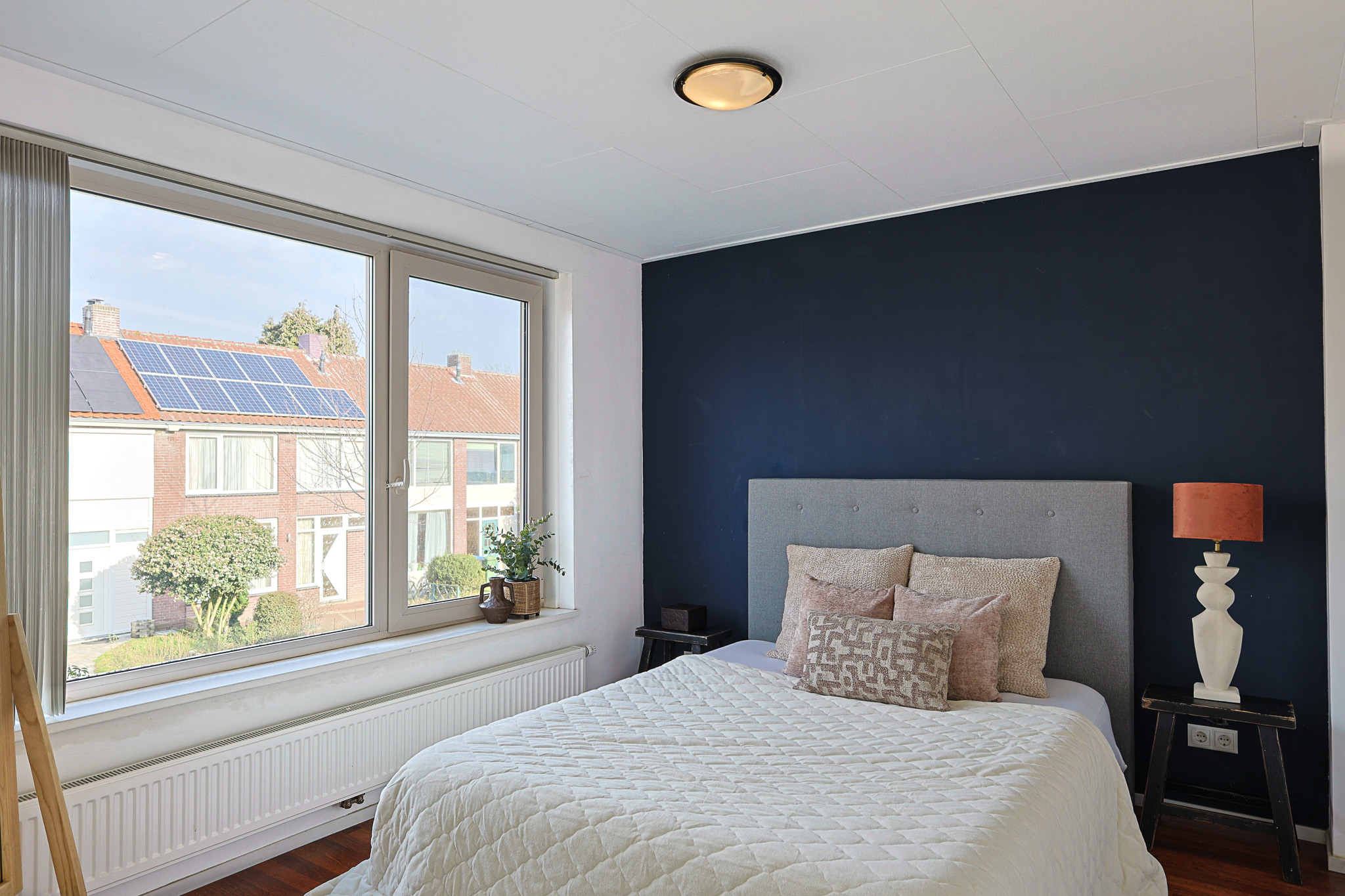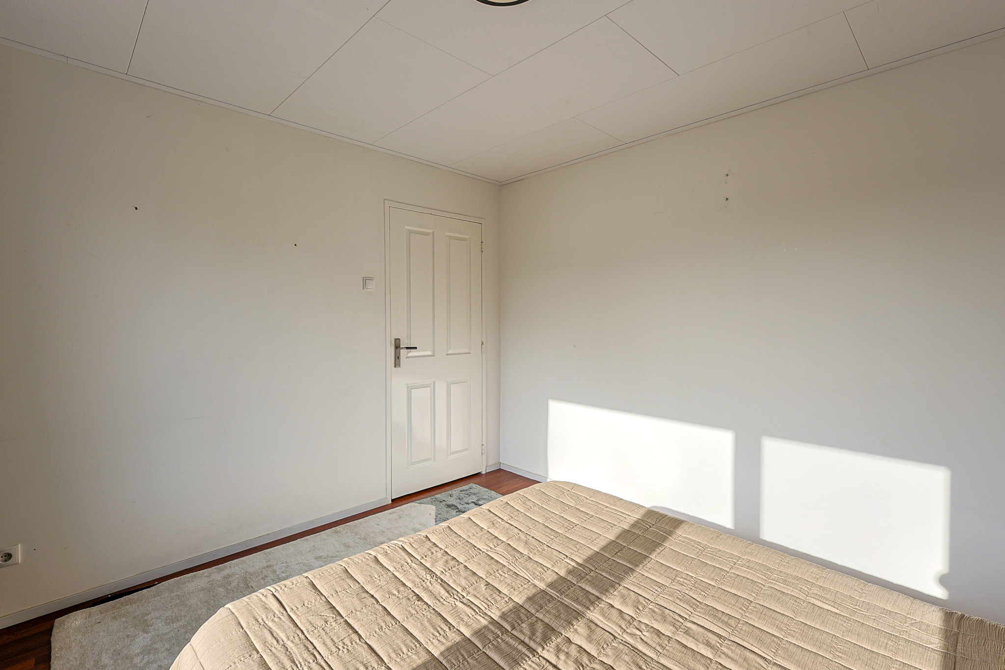 Aan de achterzijde van de woning ligt de eerste slaapkamer, een ruime kamer met een groot raam en kastruimte. Aan de voorzijde bevindt zich de tweede slaapkamer, eveneens voorzien van een royale raampartij, waardoor ook hier veel licht binnenkomt. De overloop biedt ruimte voor de vaste trap naar de zolder, waar ook de omvormer van de zonnepanelen en de CV-ketel zijn geplaatst.
