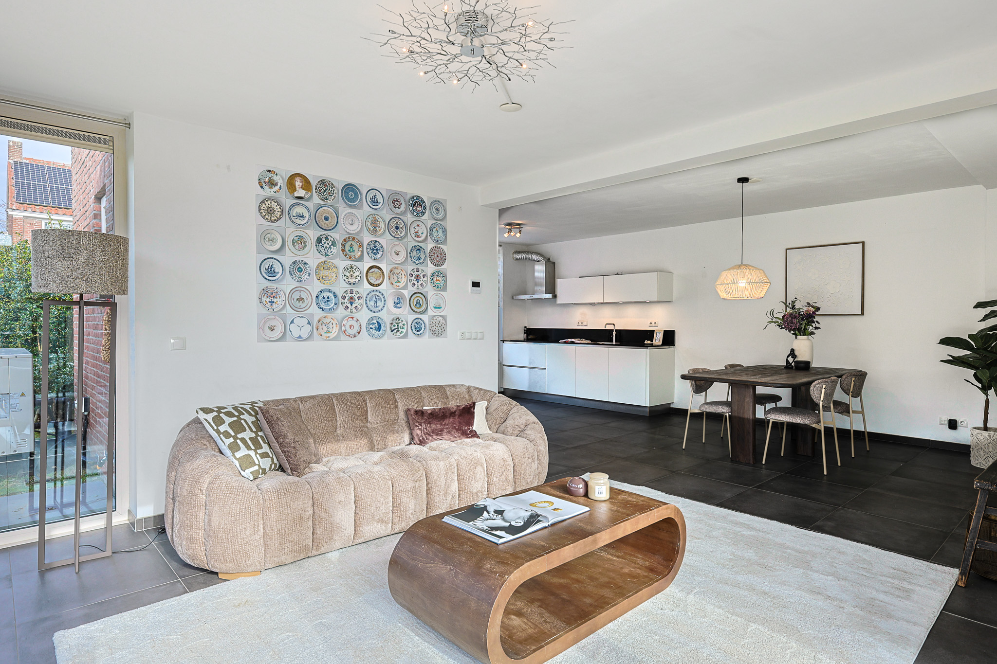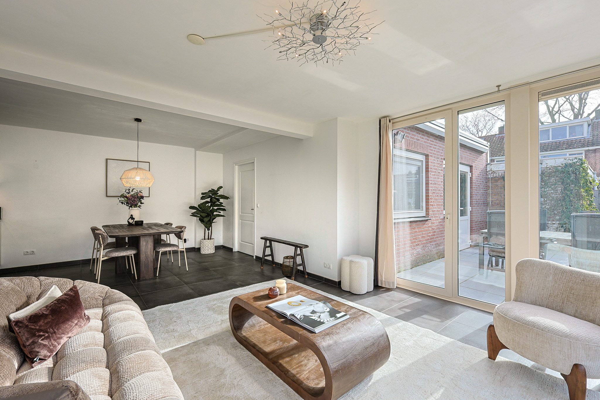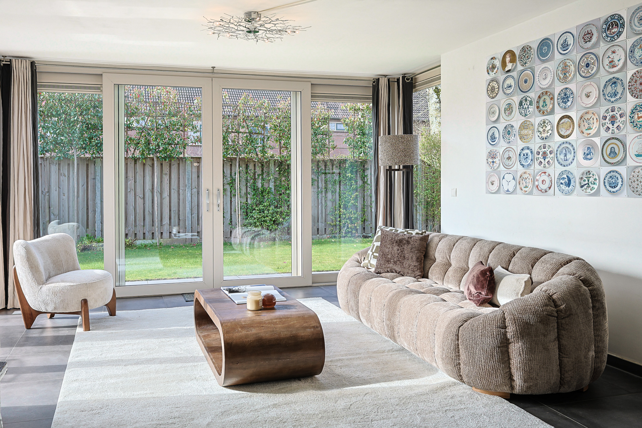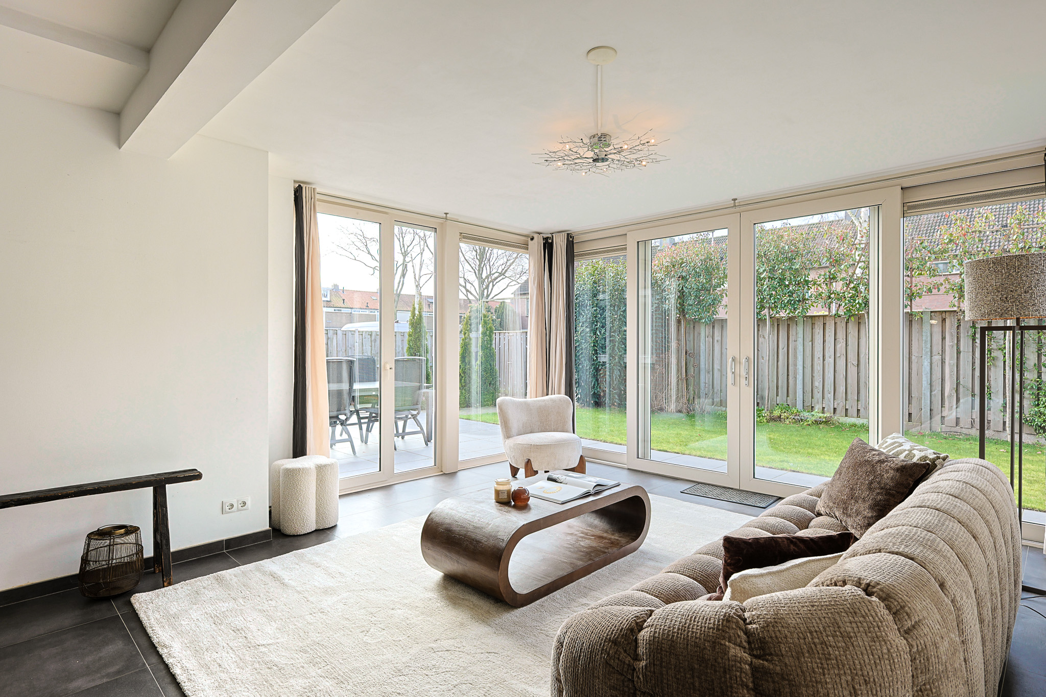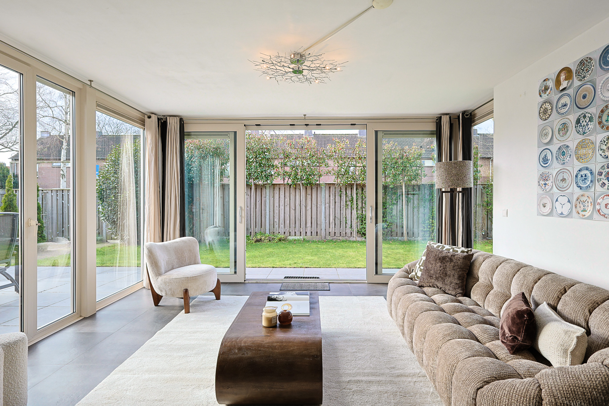 De woonkamer biedt een open leefruimte met grote raampartijen rondom. Via de schuifpui bereikt u de tuin direct vanuit de woonkamer. De ramen zijn voorzien van horren en de serrezijde beschikt over zonnescreens voor extra comfort tijdens warme dagen.