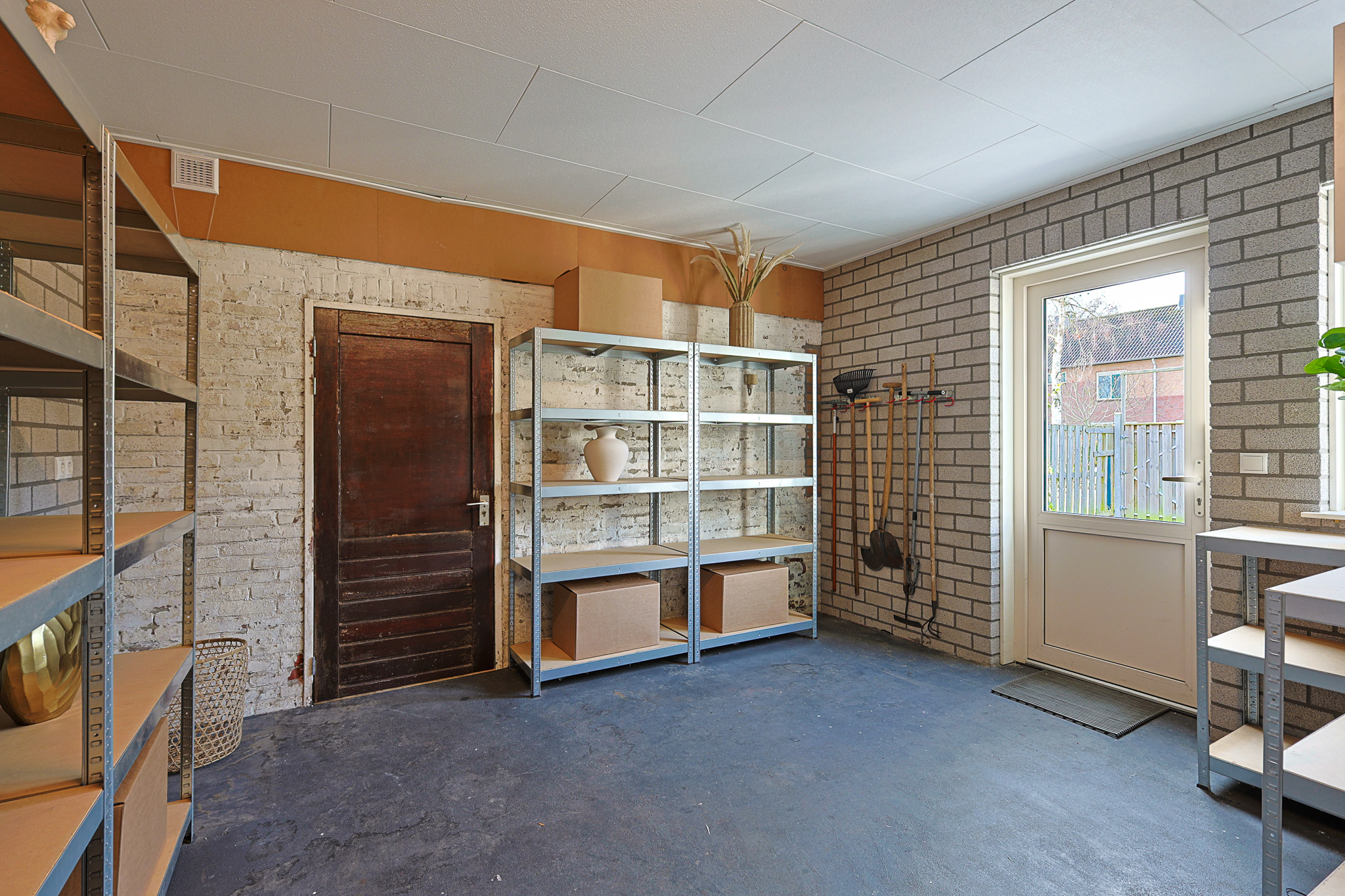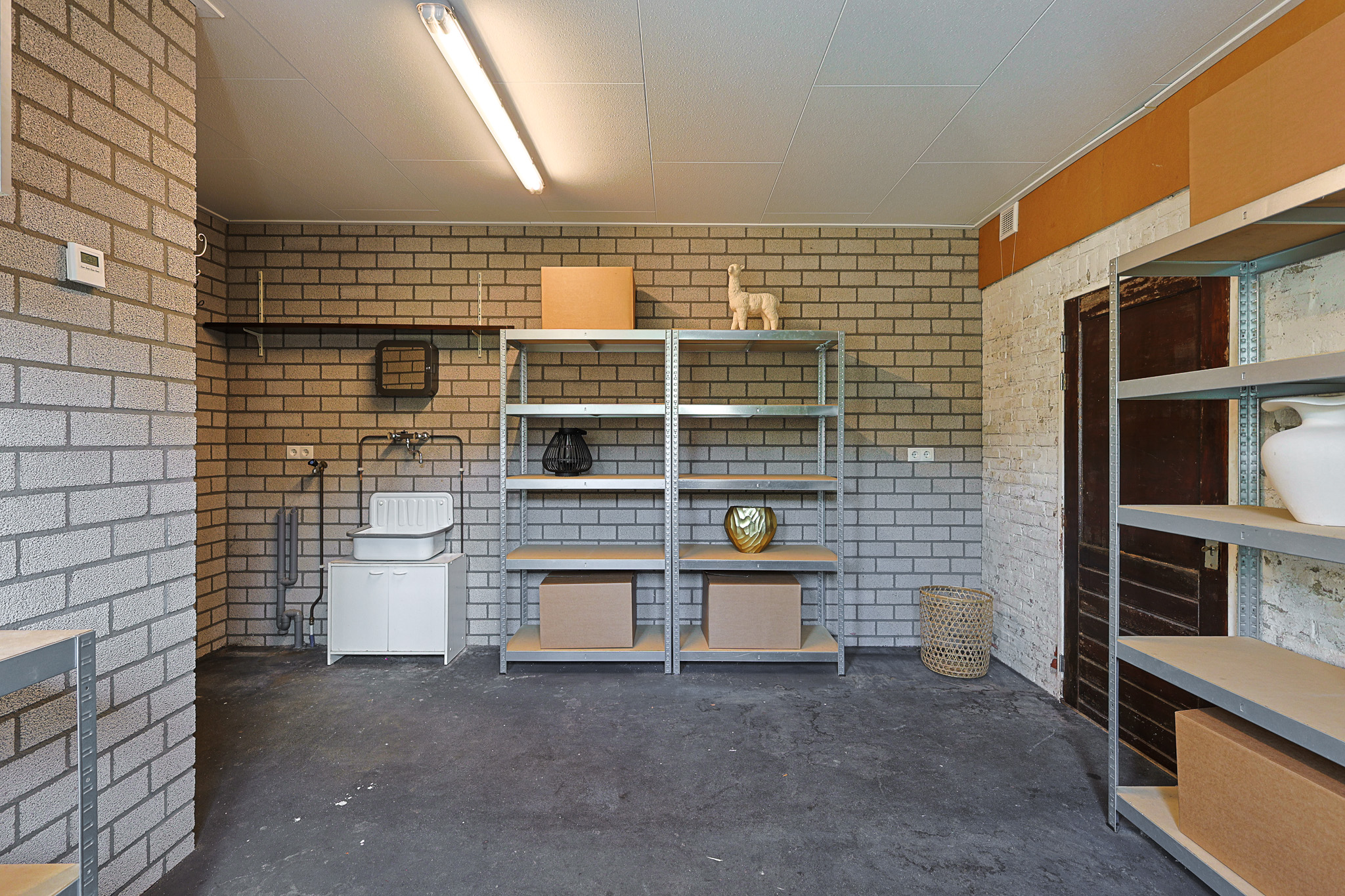 De garage is uitgerust met een elektrische deur en biedt veel opbergmogelijkheden. Dankzij de ruime opzet is er voldoende plaats voor zowel een voertuig als extra opslag.