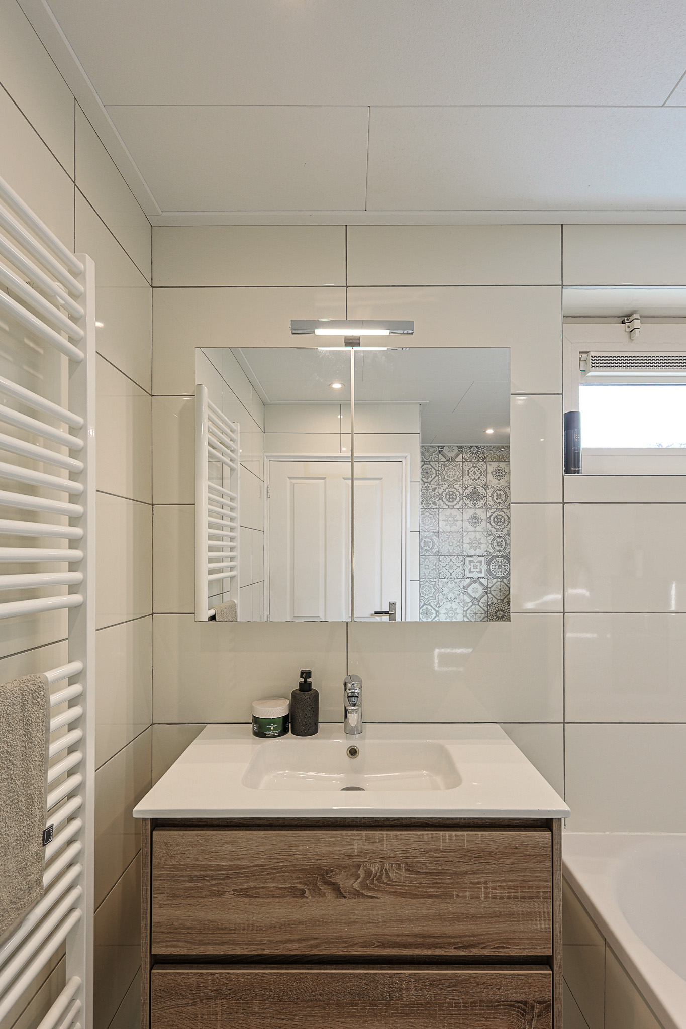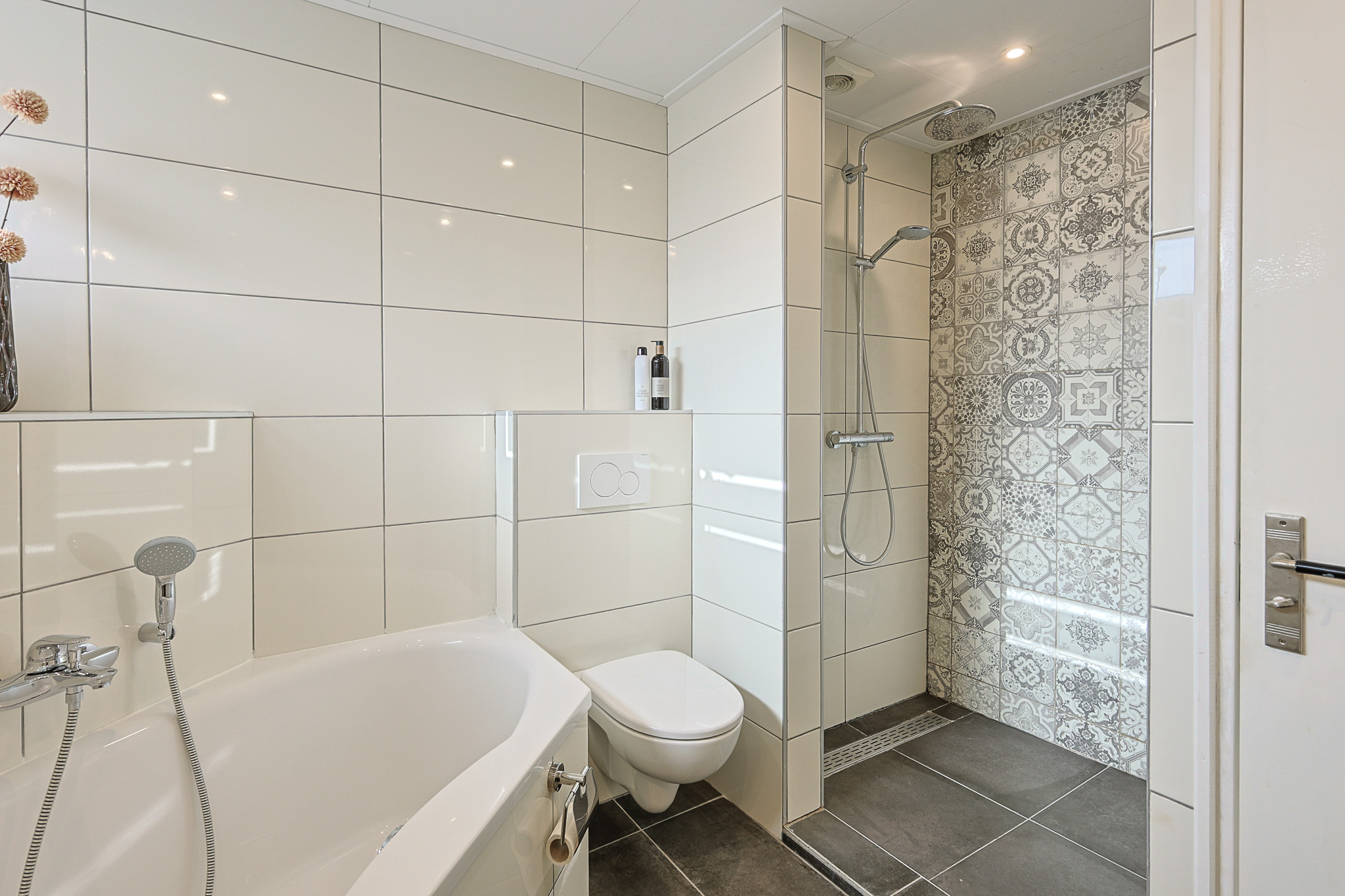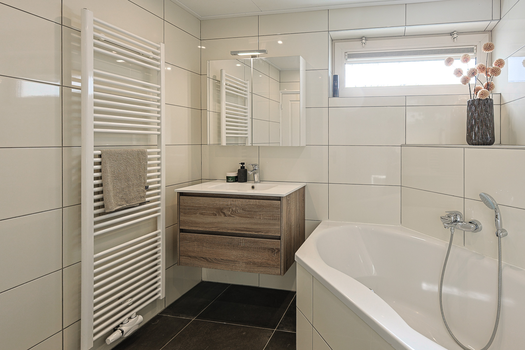 De eerste verdieping is afgewerkt met een strak laminaat en biedt een comfortabele indeling. Aan de rechterzijde bevindt zich de moderne badkamer, compleet met ligbad, inloopdouche, hangcloset, vloerverwarming, een designradiator en een stijlvol wastafelmeubel. Dankzij het aanwezige raam valt er daglicht binnen.