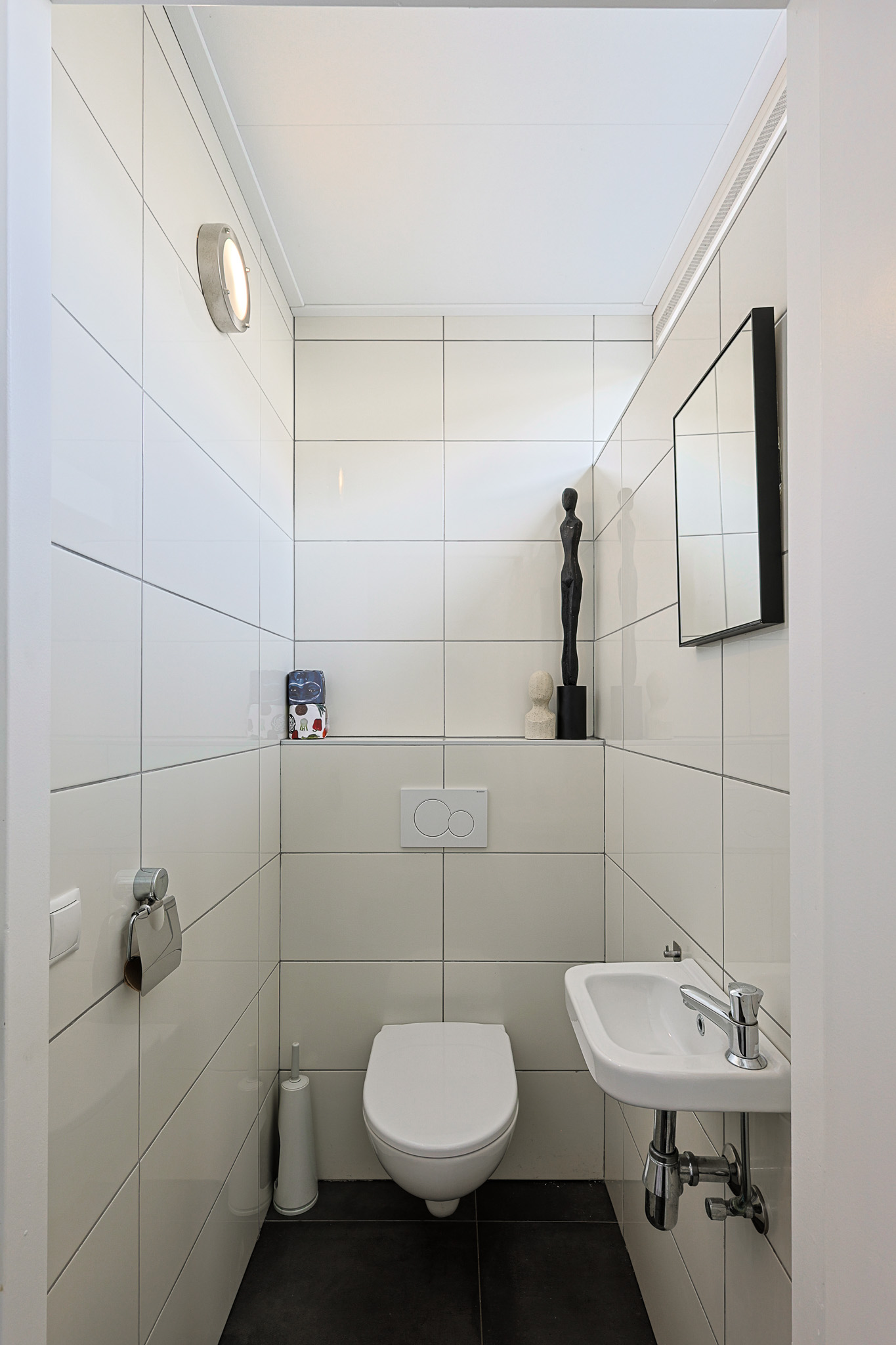 Bij binnenkomst betreedt u de hal, die is afgewerkt met een nette tegelvloer. Hier bevindt zich een separate toiletruimte met hangcloset, fonteintje en een raam voor natuurlijke ventilatie. Vanuit de hal heeft u toegang tot de diepe kelderkast waar tevens de meterkast herbergt.