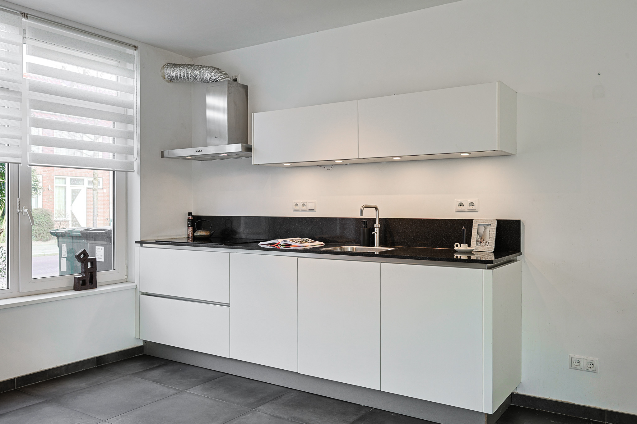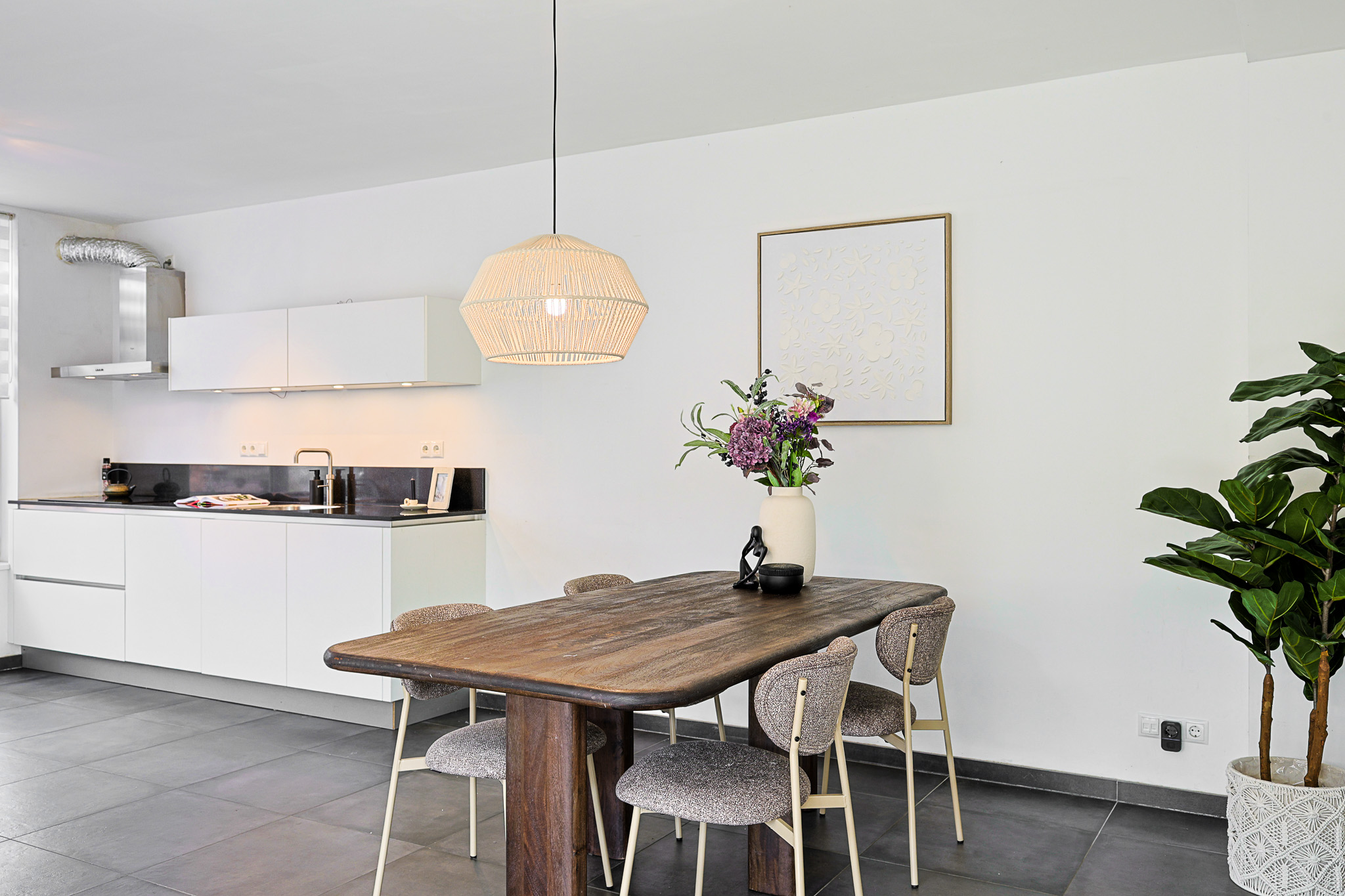 De open keuken vormt het hart van de begane grond en is uitgerust met een 4-pits Whirlpool inductie kookplaat, een inbouwkoelkast en een combi-oven/magnetron. Dankzij de open verbinding staat de keuken in direct contact met de woonkamer, wat zorgt voor een ruim geheel.